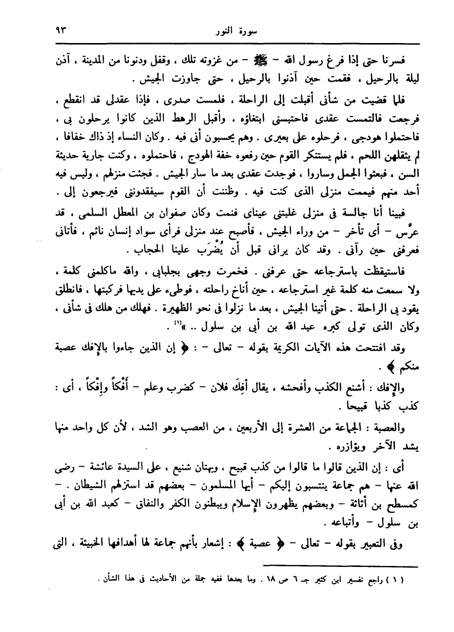 فبينا أنا جالسة في منزلي غلبتني عيناي فنمت وكان صفوان بن المعطل السلمى، قد عرّس- أى تأخر- من وراء الجيش، فأصبح عند منزلي فرأى سواد إنسان نائم، فأتانى فعرفني حين رآني. وقد كان يراني قبل أن يضرب علينا الحجاب.