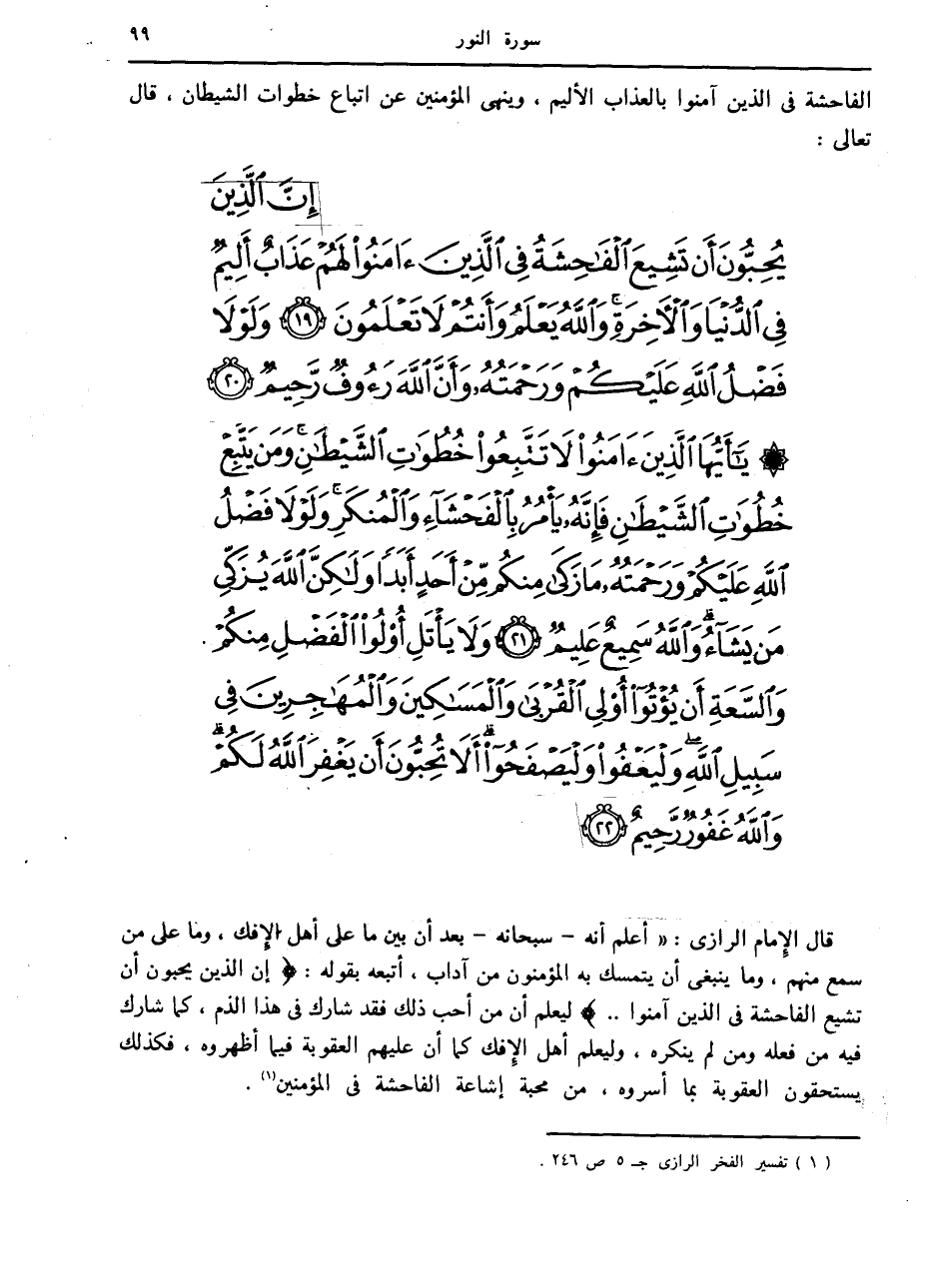 إِنَّ الَّذِينَ يُحِبُّونَ أَنْ تَشِيعَ الْفاحِشَةُ فِي الَّذِينَ آمَنُوا لَهُمْ عَذابٌ أَلِيمٌ فِي الدُّنْيا وَالْآخِرَةِ وَاللَّهُ يَعْلَمُ وَأَنْتُمْ لا تَعْلَمُونَ (19) وَلَوْلا فَضْلُ اللَّهِ عَلَيْكُمْ وَرَحْمَتُهُ وَأَنَّ اللَّهَ رَؤُفٌ رَحِيمٌ (20) يا أَيُّهَا الَّذِينَ آمَنُوا لا تَتَّبِعُوا خُطُواتِ الشَّيْطانِ وَمَنْ يَتَّبِعْ خُطُواتِ الشَّيْطانِ فَإِنَّهُ يَأْمُرُ بِالْفَحْشاءِ وَالْمُنْكَرِ وَلَوْلا فَضْلُ اللَّهِ عَلَيْكُمْ وَرَحْمَتُهُ ما زَكى مِنْكُمْ مِنْ أَحَدٍ أَبَداً وَلكِنَّ اللَّهَ يُزَكِّي مَنْ يَشاءُ وَاللَّهُ سَمِيعٌ عَلِيمٌ (21) وَلا يَأْتَلِ أُولُوا الْفَضْلِ مِنْكُمْ وَالسَّعَةِ أَنْ يُؤْتُوا أُولِي الْقُرْبى وَالْمَساكِينَ وَالْمُهاجِرِينَ فِي سَبِيلِ اللَّهِ وَلْيَعْفُوا وَلْيَصْفَحُوا أَلا تُحِبُّونَ أَنْ يَغْفِرَ اللَّهُ لَكُمْ وَاللَّهُ غَفُورٌ رَحِيمٌ (22)