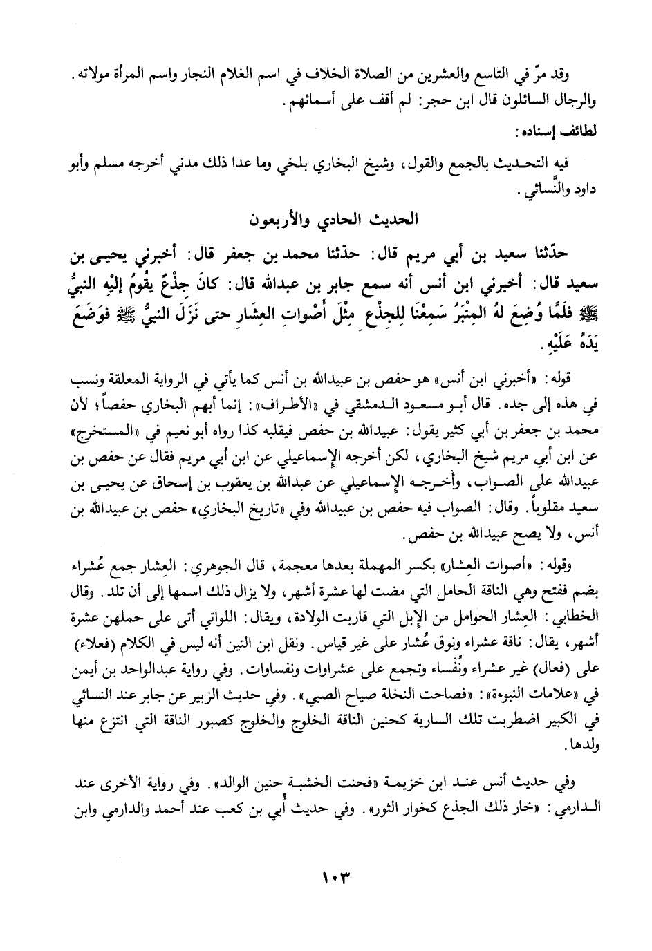 وفي حديث أنس عند ابن خزيمة "فحنت الخشبة حنين الوالد". وفي رواية الأخرى عند الدارمي: "خار ذلك الجذع كخوار الثور". وفي حديث أُبي بن كعب عند أحمد والدارمي وابن