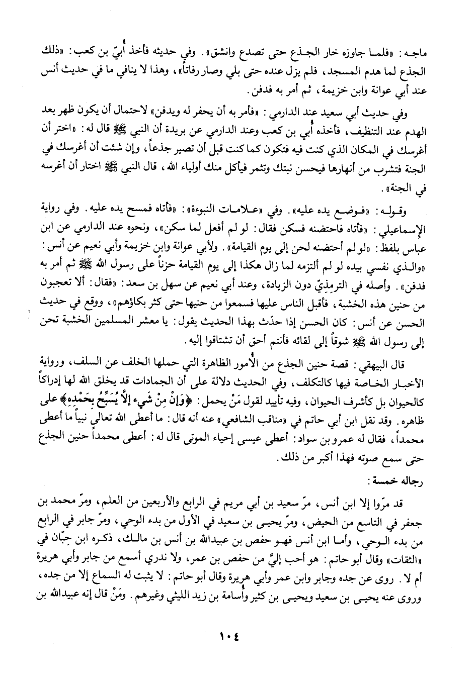 ماجه: "فلما جاوزه خار الجذع حتى تصدع وانشق". وفي حديثه فأخذ أُبيّ بن كعب: "ذلك الجذع لما هدم المسجد، فلم يزل عنده حتى بلي وصار رفاتًا"، وهذا لا ينافي ما في حديث أنس عند أبي عوانة وابن خزيمة، ثم أمر به فدفن.