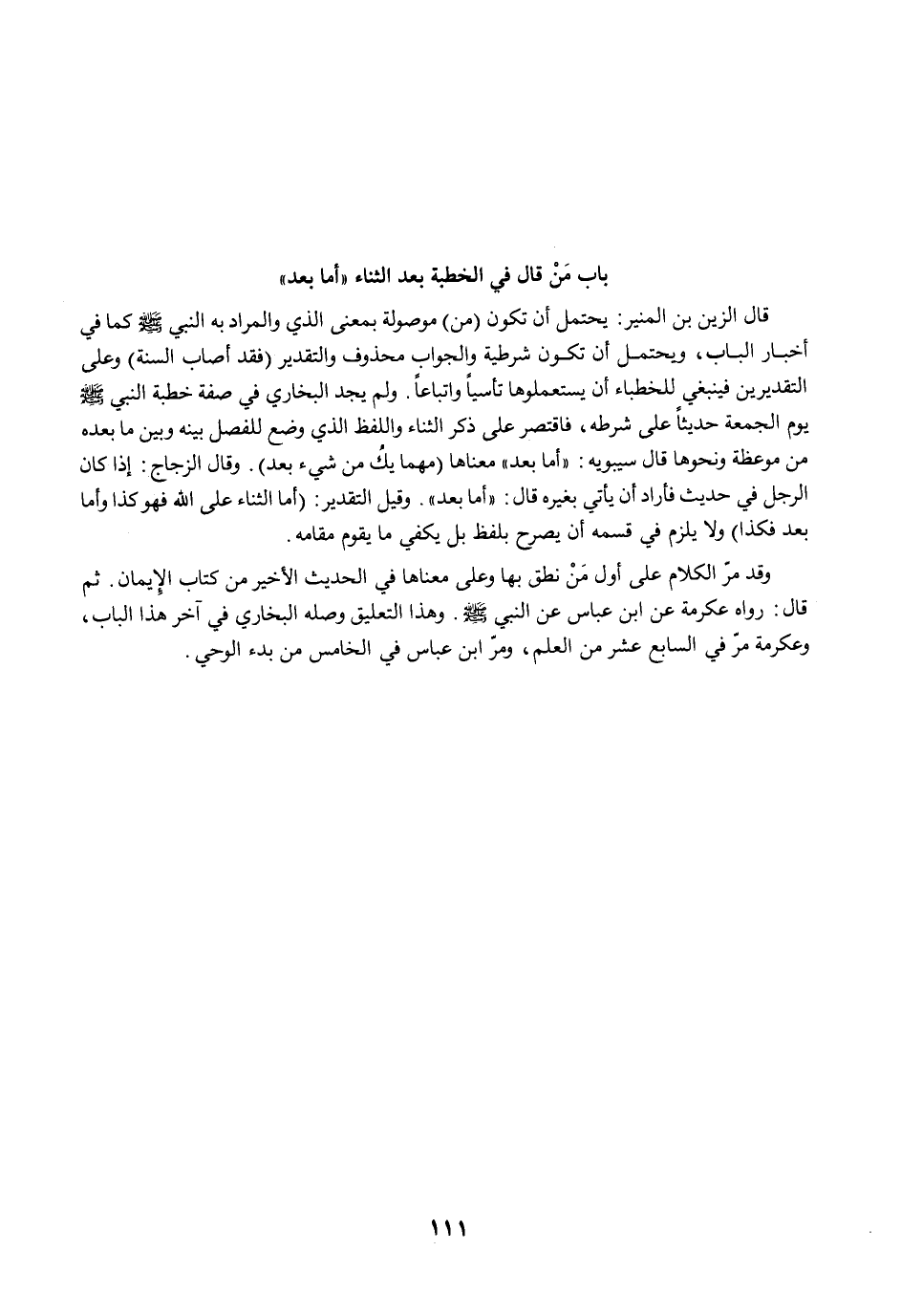 قال الزين بن المنير: يحتمل أن تكون (من) موصولة بمعنى الذي والمراد به النبي -صلى الله عليه وسلم- كما في أخبار الباب، ويحتمل أن تكون شرطية والجواب محذوف والتقدير (فقد أصاب السنة) وعلى التقديرين فينبغي للخطباء أن يستعملوها تأسياً واتباعًا. ولم يجد البخاري في صفة خطبة النبي -صلى الله عليه وسلم- يوم الجمعة حديثًا على شرطه، فاقتصر على ذكر الئناء واللفظ الذي وضع للفصل بينه وبين ما بعده من موعظة ونحوها قال سيبويه: "أما بعد" معناها (مهما يكُ من شيء بعد). وقال الزجاج: إذا كان الرجل في حديث فأراد أن يأتي بغيره قال: "أما بعد". وقيل التقدير: (أما الثناء على الله فهو كذا وأما بعد فكذا) ولا يلزم في قسمه أن يصرح بلفظ بل يكفي ما يقوم مقامه.