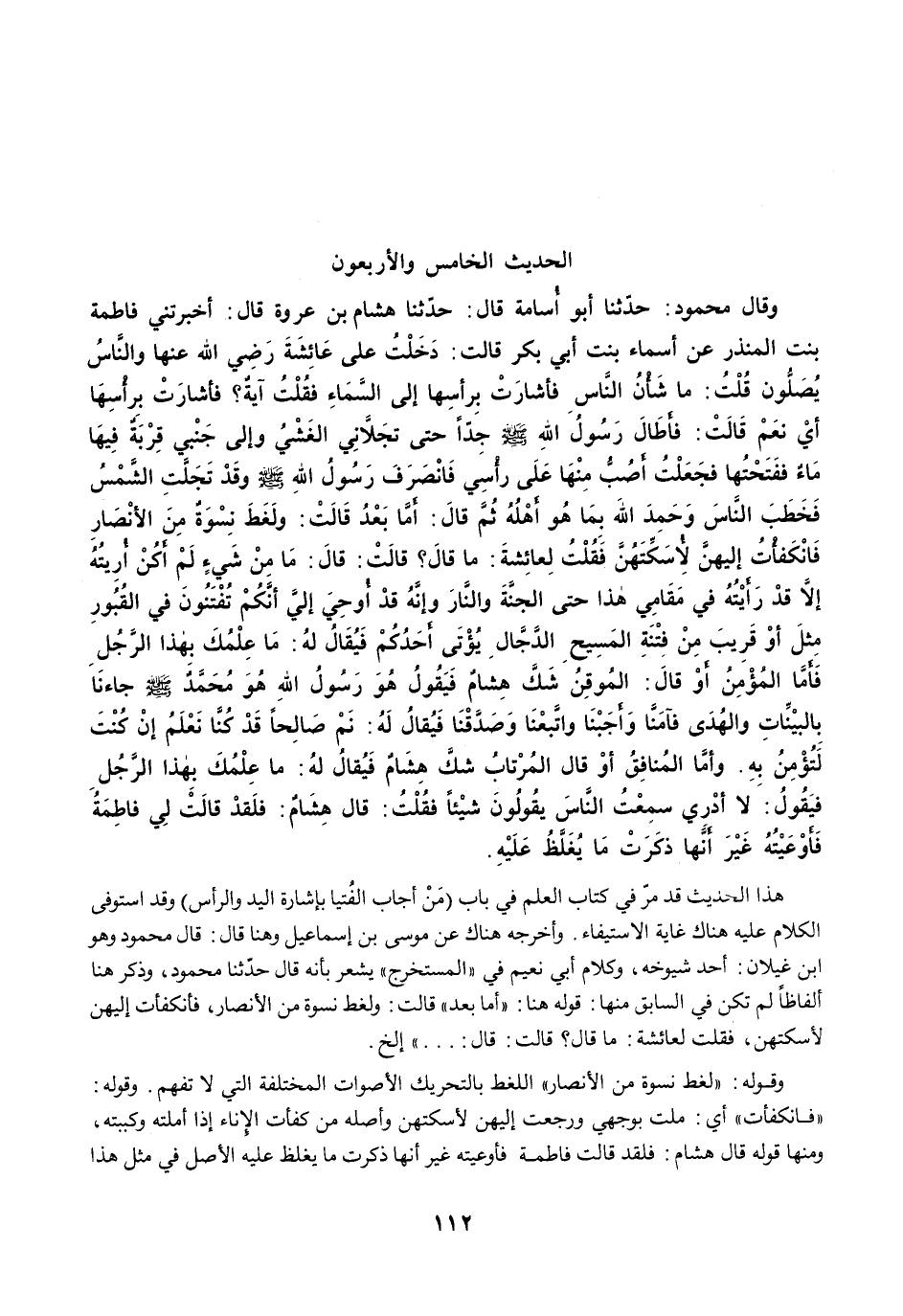 وَقَالَ مَحْمُودٌ: حَدَّثَنَا أَبُو أُسَامَةَ قَالَ: حَدَّثَنَا هِشَامُ بْنُ عُرْوَةَ قَالَ: أَخْبَرَتْنِي فَاطِمَةُ بِنْتُ الْمُنْذِرِ عَنْ أَسْمَاءَ بِنْتِ أَبِي بَكْرٍ قَالَتْ: دَخَلْتُ عَلَى عَائِشَةَ رضي الله عنها وَالنَّاسُ يُصَلُّونَ قُلْتُ: مَا شَأْنُ النَّاسِ فَأَشَارَتْ بِرَأْسِهَا إِلَى السَّمَاءِ. فَقُلْتُ آيَةٌ؟ فَأَشَارَتْ بِرَأْسِهَا أَىْ نَعَمْ. قَالَتْ: فَأَطَالَ رَسُولُ اللَّهِ -صلى الله عليه وسلم- جِدًّا حَتَّى تَجَلاَّنِي الْغَشْيُ وَإِلَى جَنْبِي قِرْبَةٌ فِيهَا مَاءٌ فَفَتَحْتُهَا فَجَعَلْتُ أَصُبُّ مِنْهَا عَلَى رَأْسِي، فَانْصَرَفَ رَسُولُ اللَّهِ -صلى الله عليه وسلم- وَقَدْ تَجَلَّتِ الشَّمْسُ، فَخَطَبَ النَّاسَ، وَحَمِدَ اللَّهَ بِمَا هُوَ أَهْلُهُ ثُمَّ قَالَ: أَمَّا بَعْدُ. قَالَتْ: وَلَغِطَ نِسْوَةٌ مِنَ الأَنْصَارِ، فَانْكَفَأْتُ إِلَيْهِنَّ لأُسَكِّتَهُنَّ فَقُلْتُ لِعَائِشَةَ: مَا قَالَ؟ قَالَتْ: قَالَ: مَا مِنْ شَيْءٍ لَمْ أَكُنْ أُرِيتُهُ إِلاَّ قَدْ رَأَيْتُهُ فِي مَقَامِي هَذَا حَتَّى الْجَنَّةَ وَالنَّارَ، وَإِنَّهُ قَدْ أُوحِيَ إِلَيَّ أَنَّكُمْ تُفْتَنُونَ فِي الْقُبُورِ مِثْلَ أَوْ قَرِيبَ مِنْ فِتْنَةِ الْمَسِيحِ الدَّجَّالِ، يُؤْتَى أَحَدُكُمْ، فَيُقَالُ لَهُ: مَا عِلْمُكَ بِهَذَا الرَّجُلِ فَأَمَّا الْمُؤْمِنُ أَوْ قَالَ: الْمُوقِنُ شَكَّ هِشَامٌ فَيَقُولُ هُوَ رَسُولُ اللَّهِ، هُوَ مُحَمَّدٌ -صلى الله عليه وسلم- جَاءَنَا بِالْبَيِّنَاتِ وَالْهُدَى فَآمَنَّا وَأَجَبْنَا وَاتَّبَعْنَا وَصَدَّقْنَا. فَيُقَالُ لَهُ: نَمْ صَالِحًا، قَدْ كُنَّا نَعْلَمُ إِنْ كُنْتَ لَتُؤْمِنُ بِهِ. وَأَمَّا الْمُنَافِقُ أَوْ قَالَ الْمُرْتَابُ شَكَّ هِشَامٌ فَيُقَالُ لَهُ: مَا عِلْمُكَ بِهَذَا الرَّجُلِ فَيَقُولُ: لاَ أَدْرِي، سَمِعْتُ النَّاسَ يَقُولُونَ شَيْئًا فَقُلْتُ. قَالَ هِشَامٌ: فَلَقَدْ قَالَتْ لِي فَاطِمَةُ فَأَوْعَيْتُهُ، غَيْرَ أَنَّهَا ذَكَرَتْ مَا يُغَلِّظُ عَلَيْهِ.