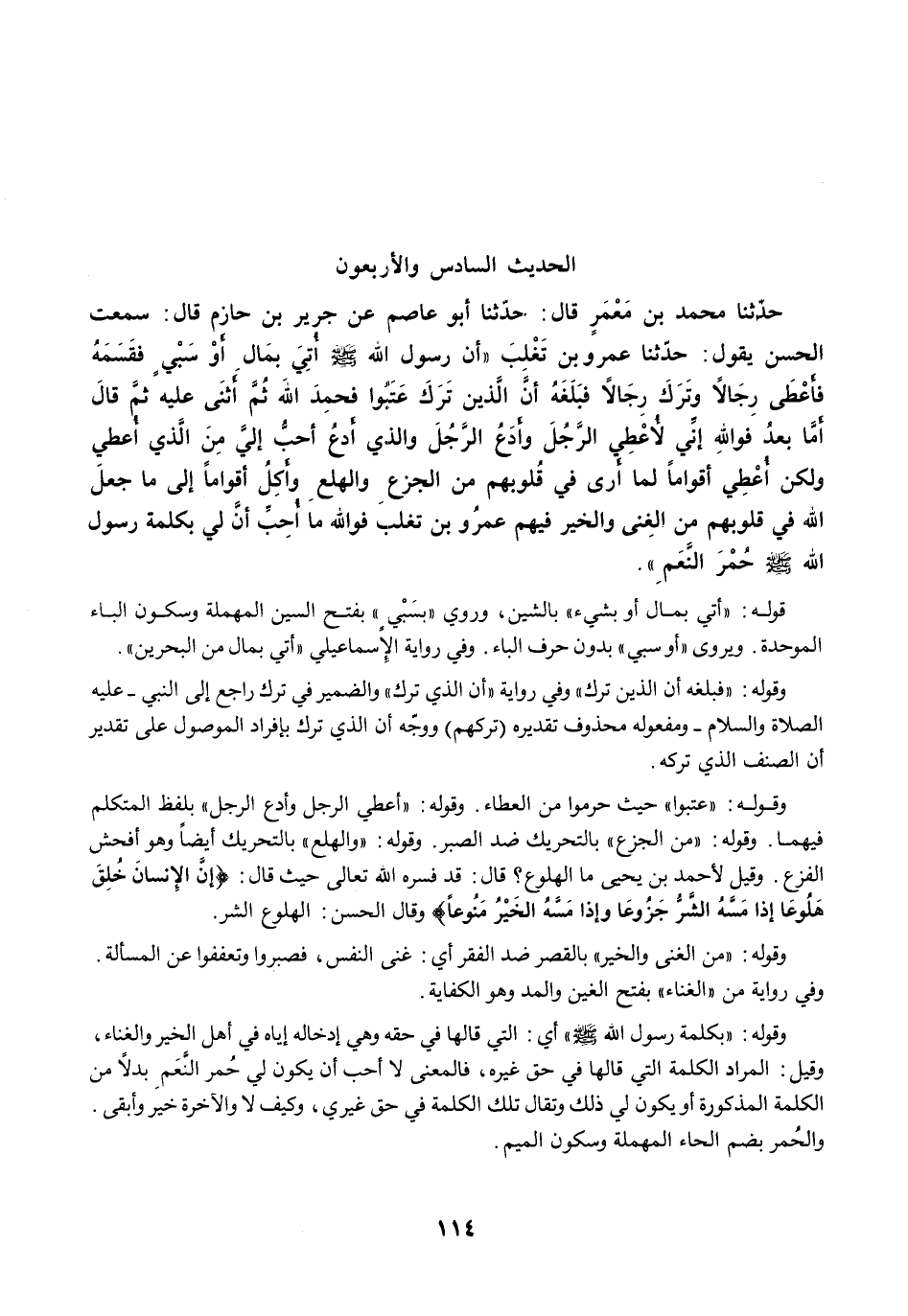 حَدَّثَنَا مُحَمَّدُ بْنُ مَعْمَرٍ قَالَ: حَدَّثَنَا أَبُو عَاصِمٍ عَنْ جَرِيرِ بْنِ حَازِمٍ قَالَ: سَمِعْتُ الْحَسَنَ يَقُولُ: حَدَّثَنَا عَمْرُو بْنُ تَغْلِبَ "أَنَّ رَسُولَ اللَّهِ -صلى الله عليه وسلم- أُتِيَ بِمَالٍ أَوْ سَبْيٍ فَقَسَمَهُ، فَأَعْطَى رِجَالاً وَتَرَكَ رِجَالاً فَبَلَغَهُ أَنَّ الَّذِينَ تَرَكَ عَتَبُوا، فَحَمِدَ اللَّهَ ثُمَّ أَثْنَى عَلَيْهِ، ثُمَّ قَالَ أَمَّا بَعْدُ، فَوَاللَّهِ إِنِّي لأُعْطِي الرَّجُلَ، وَأَدَعُ الرَّجُلَ، وَالَّذِى أَدَعُ أَحَبُّ إِلَيَّ مِنَ الَّذِي أُعْطِي وَلَكِنْ أُعْطِي أَقْوَامًا لِمَا أَرَى فِي قُلُوبِهِمْ مِنَ الْجَزَعِ وَالْهَلَعِ، وَأَكِلُ أَقْوَامًا إِلَى مَا جَعَلَ اللَّهُ فِي قُلُوبِهِمْ مِنَ الْغِنَى وَالْخَيْرِ، فِيهِمْ عَمْرُو بْنُ تَغْلِبَ. فَوَاللَّهِ مَا أُحِبُّ أَنَّ لِي بِكَلِمَةِ رَسُولِ اللَّهِ -صلى الله عليه وسلم- حُمْرَ النَّعَمِ".