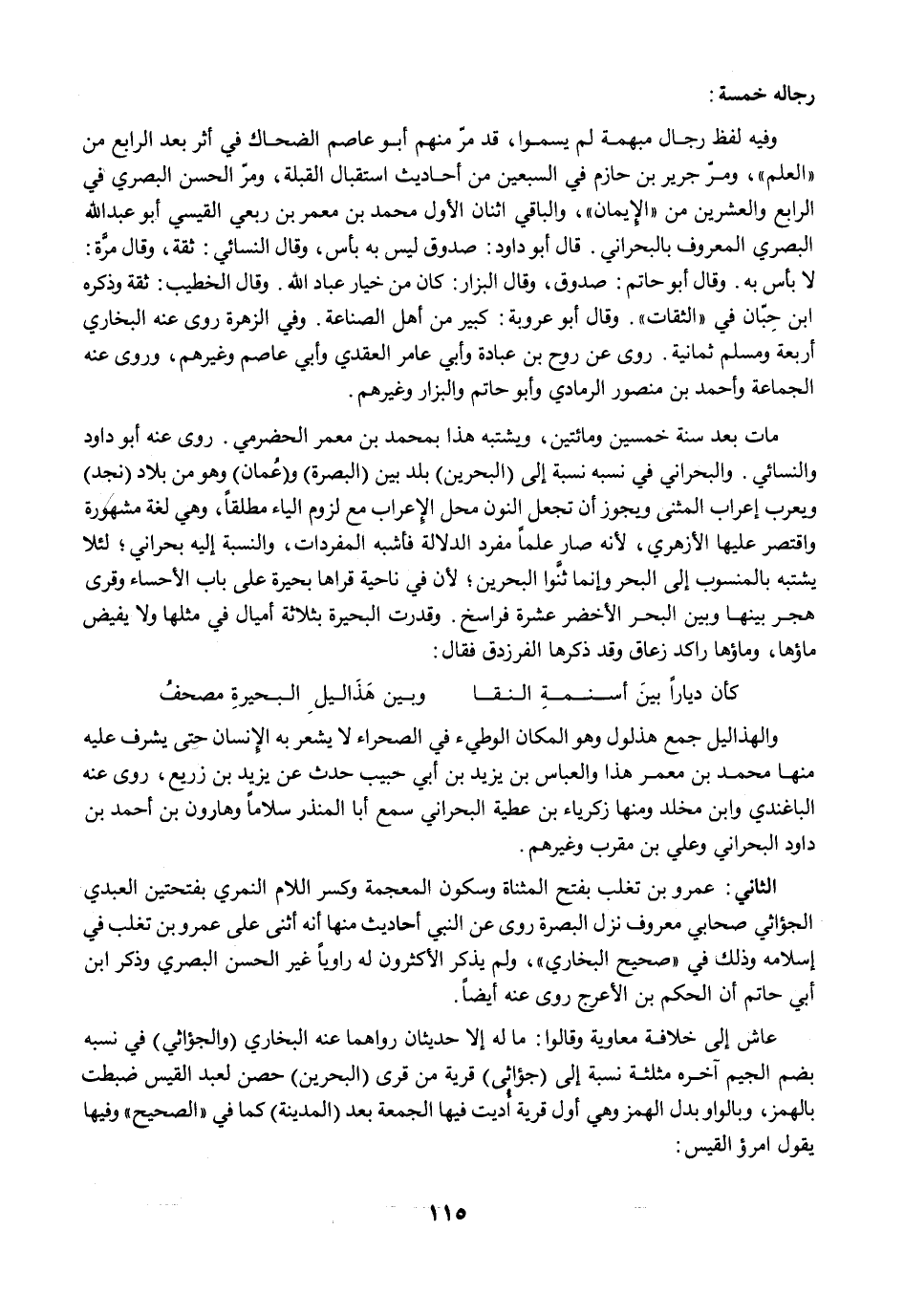 وفيه لفظ رجال مبهمة لم يسموا، قد مرّ منهم أبو عاصم الضحاك في أثر بعد الرابع من "العلم"، ومرّ جرير بن حازم في السبعين من أحاديث استقبال الفبلة، ومرّ الحسن البصري في الرابع والعشرين من "الإيمان"، والباقي اثنان الأول محمد بن معمر بن ربعي القيسي أبو عبد الله البصري المعروف بالبحراني. قال أبو داود: صدوق ليس به بأس، وقال النسائي: ثقة، وقال مرَّة: لا بأس به. وقال أبو حاتم: صدوق، وقال البزار: كان من خيار عباد الله. وقال الخطيب: ثقة وذكره ابن حِبّان في "الثقات". وقال أبو عروبة: كبير من أهل الصناعة. وفي الزهرة روى عنه البخاري أربعة ومسلم ثمانية. روى عن روح بن عبادة وأبي عامر العقدي وأبي عاصم وغيرهم، وروى عنه الجماعة وأحمد بن منصور الرمادي وأبو حاتم والبزار وغيرهم.