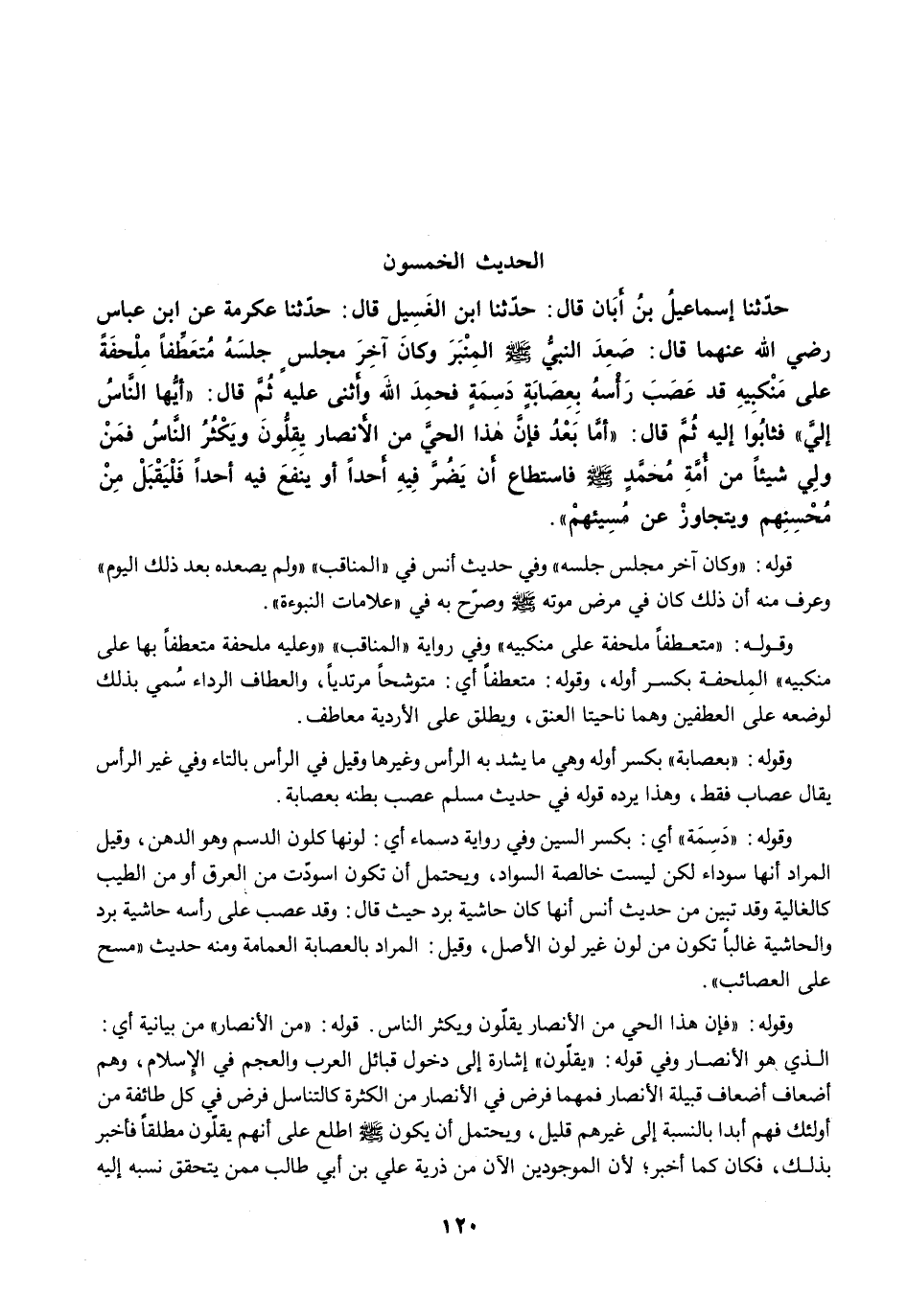 حَدَّثَنَا إِسْمَاعِيلُ بْنُ أَبَانَ قَالَ: حَدَّثَنَا ابْنُ الْغَسِيلِ قَالَ: حَدَّثَنَا عِكْرِمَةُ عَنِ ابْنِ عَبَّاسٍ رضي الله عنهما قَالَ: صَعِدَ النَّبِيُّ -صلى الله عليه وسلم- الْمِنْبَرَ وَكَانَ آخِرَ مَجْلِسٍ جَلَسَهُ مُتَعَطِّفًا مِلْحَفَةً عَلَى مَنْكِبَيْهِ، قَدْ عَصَبَ رَأْسَهُ بِعِصَابَةٍ دَسِمَةٍ، فَحَمِدَ اللَّهَ وَأَثْنَى عَلَيْهِ ثُمَّ قَالَ: "أَيُّهَا النَّاسُ إِلَيَّ". فَثَابُوا إِلَيْهِ ثُمَّ قَالَ: "أَمَّا بَعْدُ، فَإِنَّ هَذَا الْحَيَّ مِنَ الأَنْصَارِ يَقِلُّونَ، وَيَكْثُرُ النَّاسُ، فَمَنْ وَلِيَ شَيْئًا مِنْ أُمَّةِ مُحَمَّدٍ -صلى الله عليه وسلم- فَاسْتَطَاعَ أَنْ يَضُرَّ فِيهِ أَحَدًا أَوْ يَنْفَعَ فِيهِ أَحَدًا، فَلْيَقْبَلْ مِنْ مُحْسِنِهِمْ، وَيَتَجَاوَزْ عَنْ مُسِيِّهِمْ".