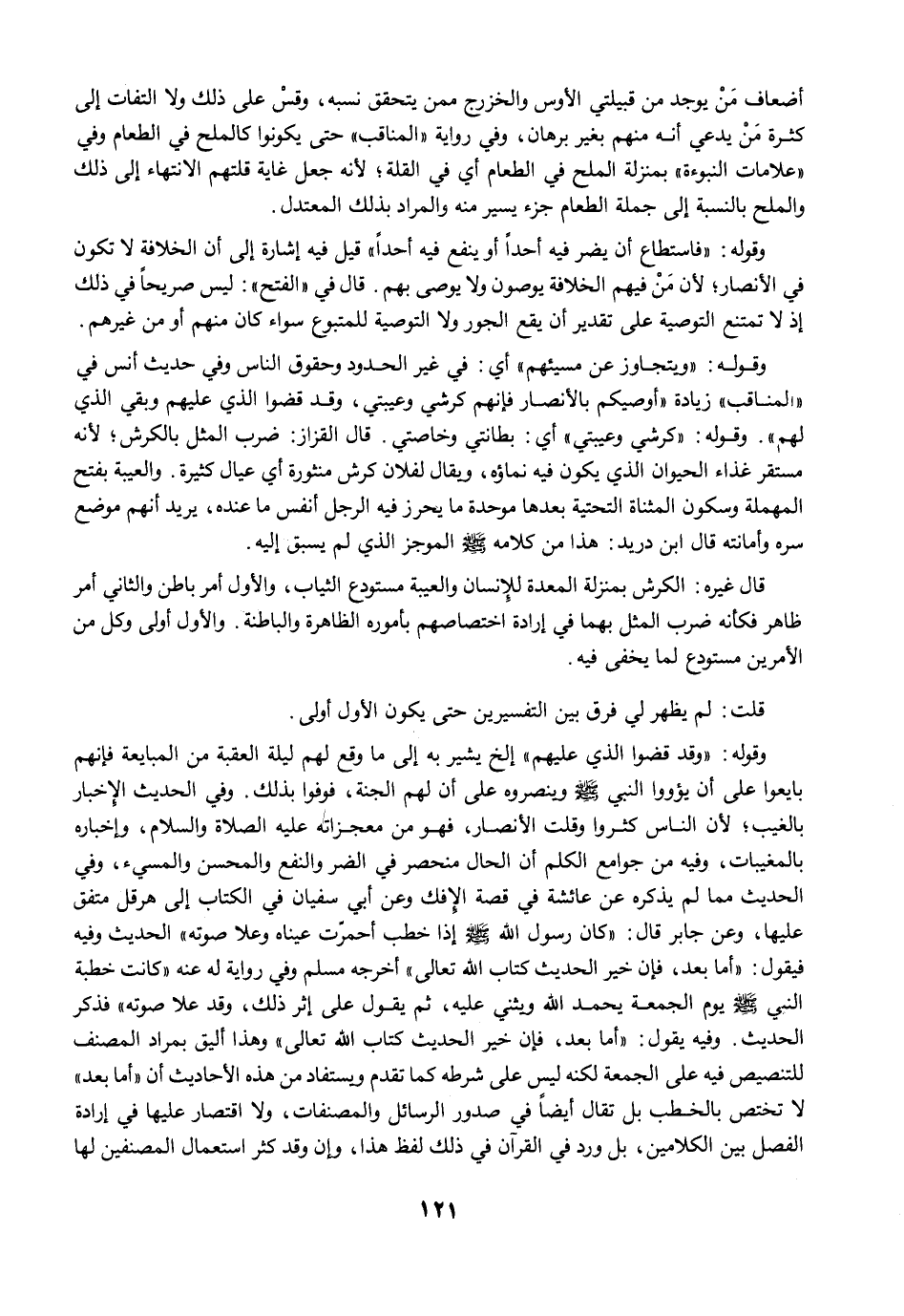 وقوله: "وقد قضوا الذي عليهم" إلخ يشير به إلى ما وقع لهم ليلة العقبة من المبايعة فإنهم بايعوا على أن يؤووا النبي -صلى الله عليه وسلم- وينصروه على أن لهم الجنة، فوفوا بذلك. وفي الحديث الإخبار بالغيب؛ لأن الناس كثروا وقلت الأنصار، فهو من معجزاته عليه الصلاة والسلام، وإخباره بالمغيبات، وفيه من جوامع الكلم أن الحال منحصر في الضر والنفع والمحسن والمسيء، وفي الحديث مما لم يذكره عن عائشة في قصة الإفك وعن أبي سفيان في الكتاب إلى هرقل متفق عليها، وعن جابر قال: "كان رسول الله -صلى الله عليه وسلم- إذا خطب أحمرّت عيناه وعلا صوته" الحديث وفيه فيقول: "أما بعد، فإن خير الحديث كتاب الله تعالى" أخرجه مسلم وفي رواية له عنه "كانت خطبة النبي -صلى الله عليه وسلم- يوم الجمعة يحمد الله ويثني عليه، ثم يقول على إثر ذلك، وقد علا صوته" فذكر الحديث. وفيه يقول: "أما بعد، فإن خير الحديث كتاب الله تعالى" وهذا أليق بمراد المصنف للتنصيص فيه على الجمعة لكنه ليس على شرطه كما تقدم ويستفاد من هذه الأحاديث أن "أما بعد" لا تختص بالخطب بل تقال أيضًا في صدور الرسائل والمصنفات، ولا اقتصار عليها في إرادة الفصل بين الكلامين، بل ورد في القرآن في ذلك لفظ هذا، وإن وقد كثر استعمال المصنفين لها