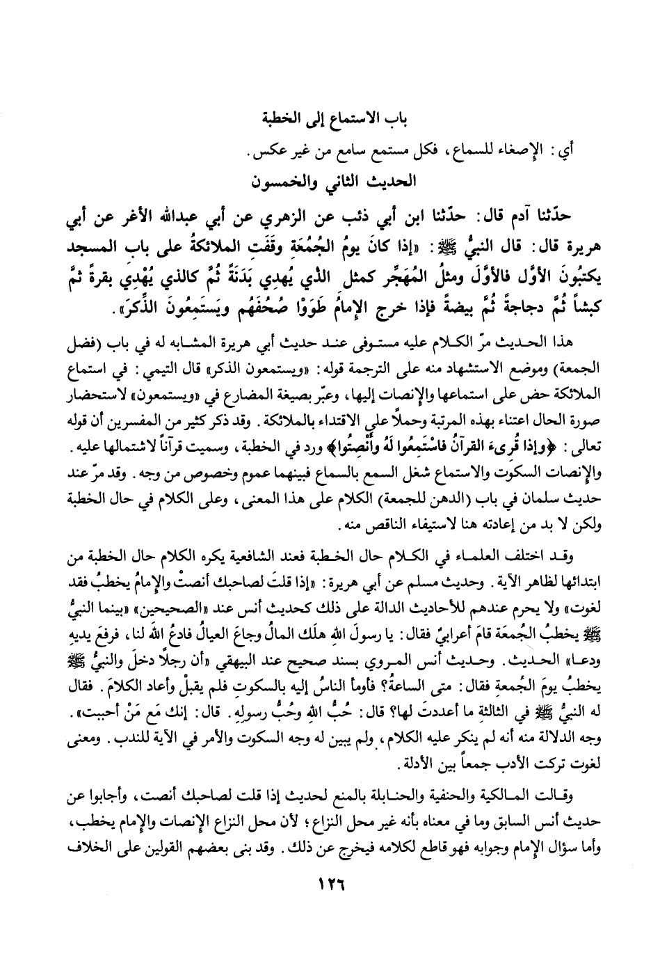 وقد اختلف العلماء في الكلام حال الخطبة فعند الشافعية يكره الكلام حال الخطبة من ابتدائها لظاهر الآية. وحديث مسلم عن أبي هريرة: "إذا قلتَ لصاحبك أنصتْ والإمامُ يخطبُ فقد لغوت" ولا يحرم عندهم للأحاديث الدالة على ذلك كحديث أنس عند "الصحيحين" "بينما النبيُّ -صلى الله عليه وسلم- يخطبُ الجُمعَة قامَ أعرابيٌ فقال: يا رسولَ اللهِ هلَك المالُ وجاعَ العيالُ فادعُ اللهَ لنا، فرفعَ يديهِ ودعا" الحديث. وحديث أنس المروي بسند صحيح عند البيهقي "أن رجلًا دخلَ والنبيُّ -صلى الله عليه وسلم- يخطبُ يومَ الجُمعةِ فقال: متى الساعةُ؟ فأومأ الناسُ إليه بالسكوتِ فلم يقبلْ وأعاد الكلامَ. فقال له النبيُّ -صلى الله عليه وسلم- في الثالثةِ ما أعددتَ لها؟ قال: حُبُّ اللُهِ وحُبُّ رسولهِ. قال: إنك مَع مَنْ أحببت". وجه الدلالة منه أنه لم ينكر عليه الكلام، ولم يبين له وجه السكوت والأمر في الآية للندب. ومعنى لغوت تركت الأدب جمعًا بين الأدلة.