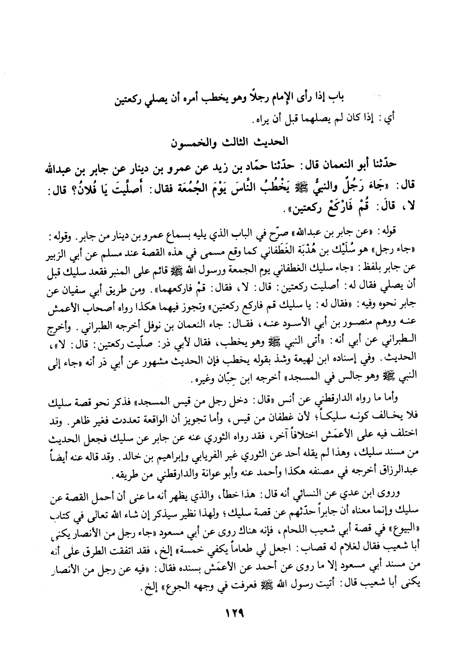 حَدَّثَنَا أَبُو النُّعْمَانِ قَالَ: حَدَّثَنَا حَمَّادُ بْنُ زَيْدٍ عَنْ عَمْرِو بْنِ دِينَارٍ عَنْ جَابِرِ بْنِ عَبْدِ اللَّهِ قَالَ: "جَاءَ رَجُلٌ وَالنَّبِىُّ -صلى الله عليه وسلم- يَخْطُبُ النَّاسَ يَوْمَ الْجُمُعَةِ فَقَالَ: أَصَلَّيْتَ يَا فُلاَنُ؟. قَالَ: لاَ. قَالَ: قُمْ فَارْكَعْ ركعتين".
