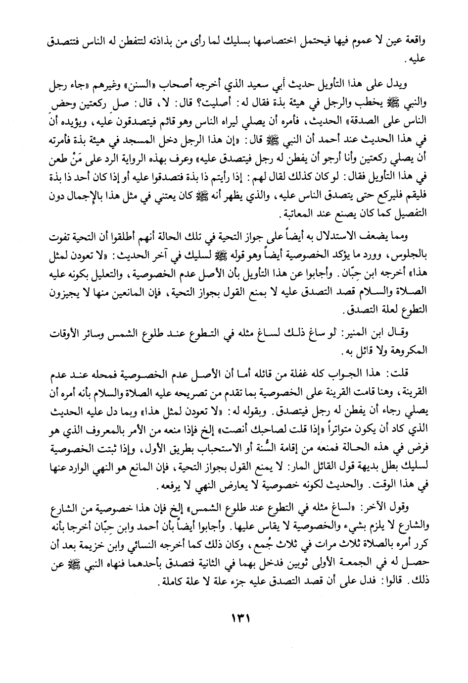 قلت: هذا الجواب كله غفلة من قائله أما أن الأصل عدم الخصوصية فمحله عند عدم القرينة، وهنا قامت القرينة على الخصوصية بما تقدم من تصريحه عليه الصلاة والسلام بأنه أمره أن يصلي رجاء أن يفطن له رجل فيتصدق. وبقوله له: "لا تعودن لمثل هذا" وبما دل عليه الحديث الذي كاد أن يكون متواترًا "إذا قلت لصاحبك أنصت" إلخ فإذا منعه من الأمر بالمعروف الذي هو فرض في هذه الحالة فمنعه من إقامة السُّنة أو الاستحباب بطريق الأول، وإذا ثبتت الخصوصية لسليك بطل بديهة قول القائل المار: لا يمنع القول بجواز التحية، فإن المانع هو النهي الوارد عنها في هذا الوقت. والحديث لكونه خصوصية لا يعارض النهي لا يرفعه.