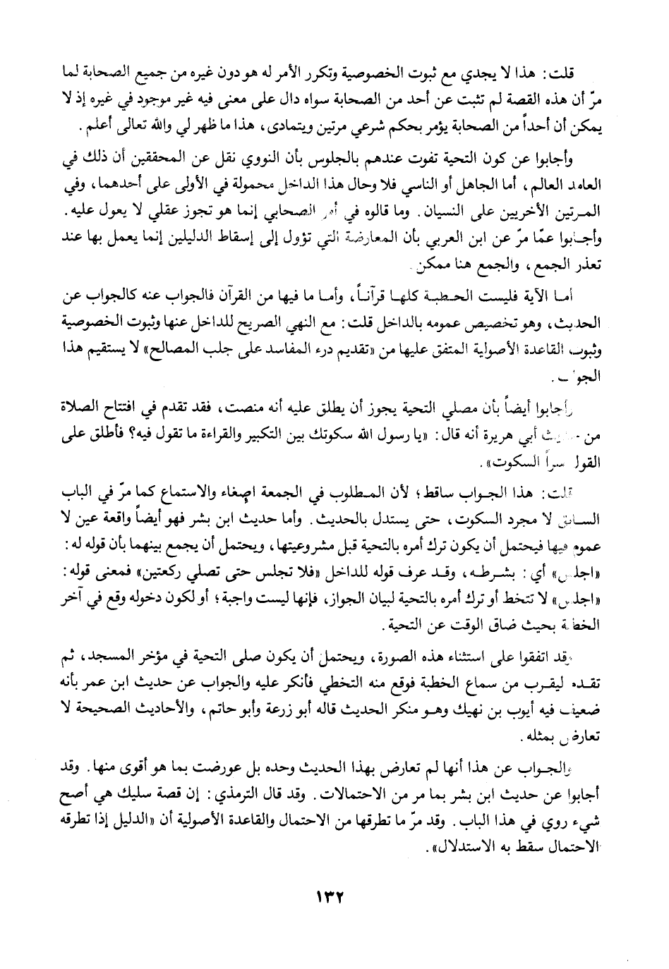 أما الآية فليست الحطبة كلها قرآنًا، وأما ما فيها من القرآن فالجواب عنه كالجواب عن الحديث، وهو تخصيص عمومه بالداخل قلت: مع النهي الصريح للداخل عنها وثبوت الخصوصية وثبوب القاعدة الأصولية المتفق عليها من "تقديم درء المفاسد على جلب المصالح" لا يستقيم هذا الجواب.
