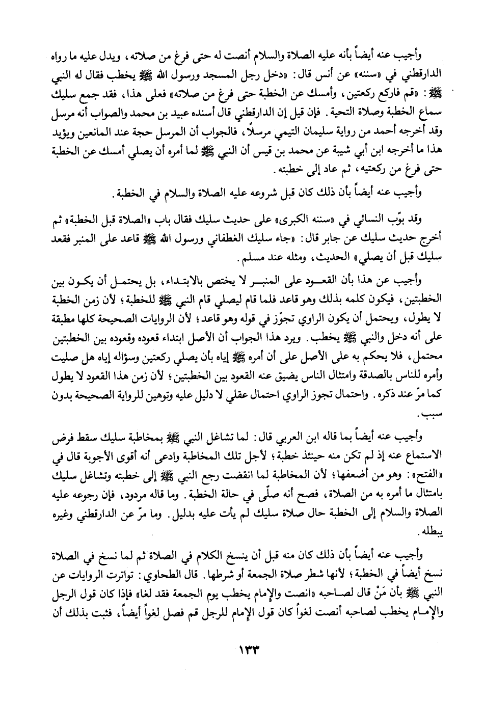 وأجيب عنه أيضًا بما قاله ابن العربي قال: لما تشاغل النبي -صلى الله عليه وسلم- بمخاطبة سليك سقط فرض الاستماع عنه إذ لم تكن منه حينئذ خطبة؛ لأجل تلك المخاطبة وادعى أنه أقوى الأجوبة قال في "الفتح": وهو من أضعفها؛ لأن المخاطبة لما انقضت رجع النبي -صلى الله عليه وسلم- إلى خطبته وتشاغل سليك بامتثال ما أمره به من الصلاة، فصح أنه صلى في حالة الخطبة. وما قاله مردود، فإن رجوعه عليه الصلاة والسلام إلى الخطبة حال صلاة سليك لم يأت عليه بدليل. وما مرّ عن الدارقطني وغيره يبطله.