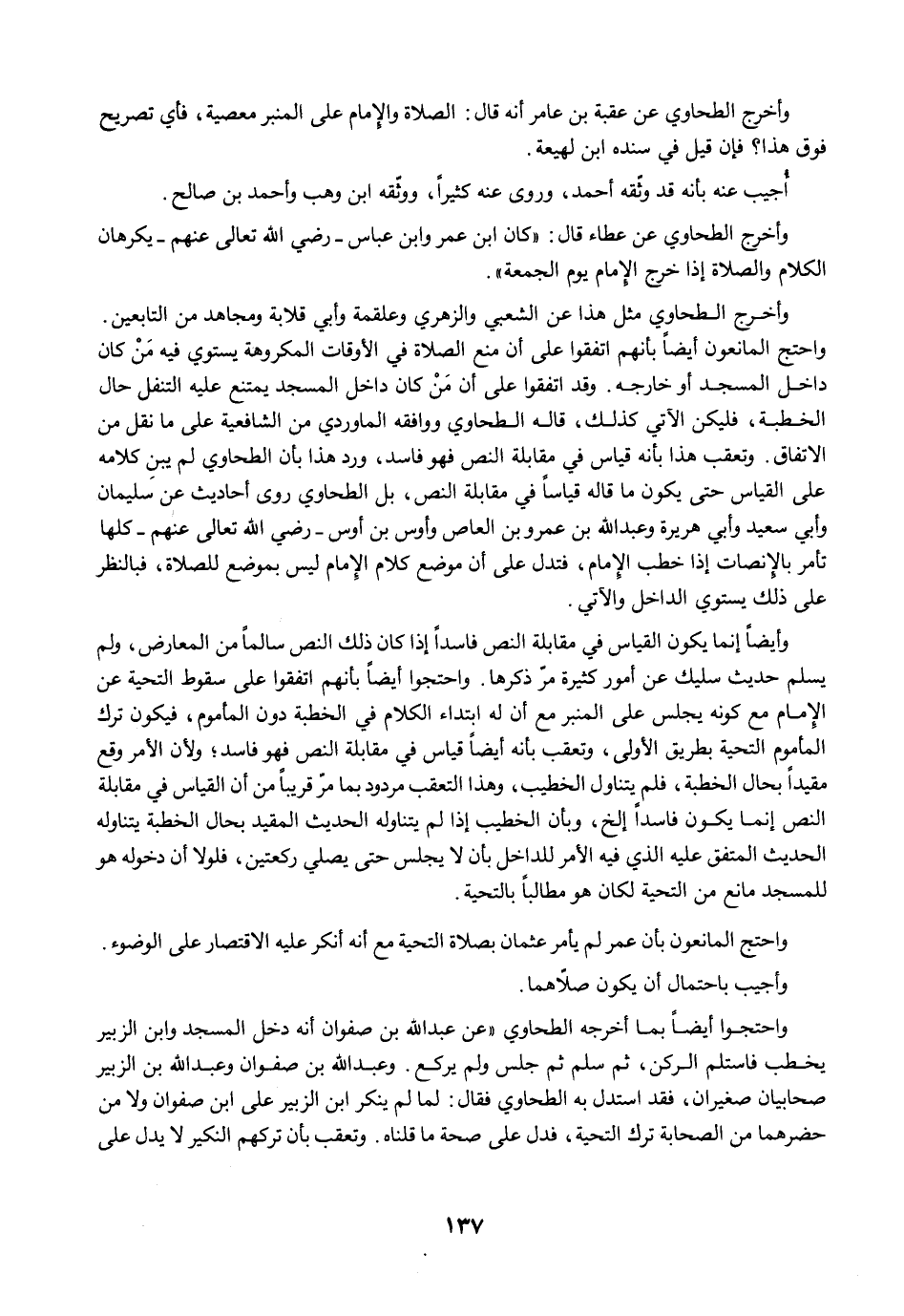 واحتجوا أيضًا بما أخرجه الطحاوي "عن عبد الله بن صفوان أنه دخل المسجد وابن الزبير يخطب فاستلم الركن، ثم سلم ثم جلس ولم يركع. وعبد الله بن صفوان وعبد الله بن الزبير صحابيان صغيران، فقد استدل به الطحاوي فقال: لما لم ينكر ابن الزبير على ابن صفوان ولا من حضرهما من الصحابة ترك التحية، فدل على صحة ما قلناه. وتعقب بأن تركهم النكير لا يدل على