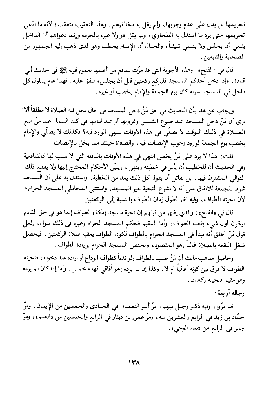 تحريمها بل يدل على عدم وجوبها، ولم يقل به مخالفوهم. وهذا التعقيب متعقب؛ لأنه ما ادّعى تحريمها حتى يرد ما استدل به الطحاوي، ولم يقل هو ولا غيره بالحرمة وإنما دعواهم أن الداخل ينبغي أن يجلس ولا يصلي شيئًا، والحال أن الإمام يخطب وهو الذي ذهب إليه الجمهور من الصحابة والتابعين.