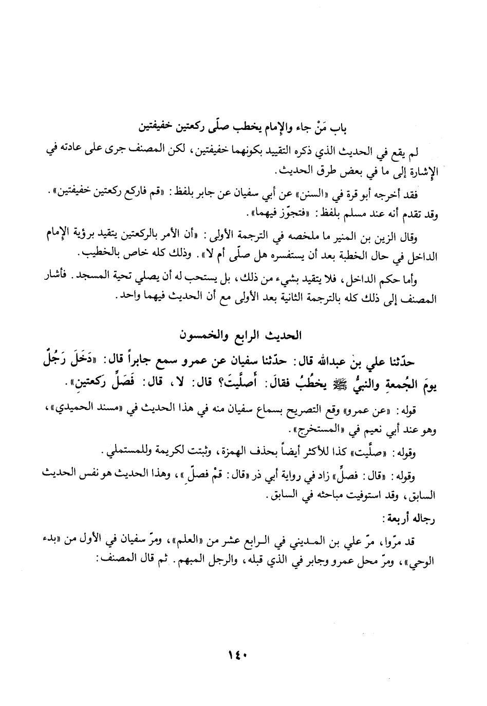 حَدَّثَنَا عَلِيُّ بْنُ عَبْدِ اللَّهِ قَالَ: حَدَّثَنَا سُفْيَانُ عَنْ عَمْرٍو سَمِعَ جَابِرًا قَالَ: "دَخَلَ رَجُلٌ يَوْمَ الْجُمُعَةِ وَالنَّبِىُّ -صلى الله عليه وسلم- يَخْطُبُ فَقَالَ: أَصَلَّيْتَ؟. قَالَ: لاَ. قَالَ: فَصَلِّ رَكْعَتَيْنِ".