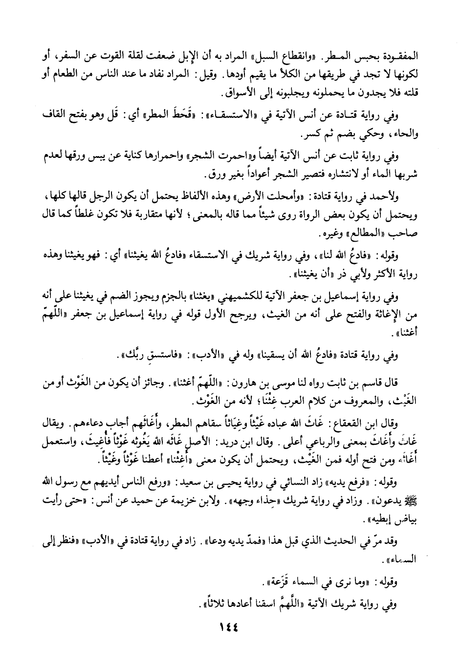 قال قاسم بن ثابت رواه لنا موسى بن هارون: "اللهمّ أغثنا". وجائز أن يكون من الغَوْث أو من الغَيْث، والمعروف من كلام العرب غِثْنَا؛ لأنه من الغَوْث.