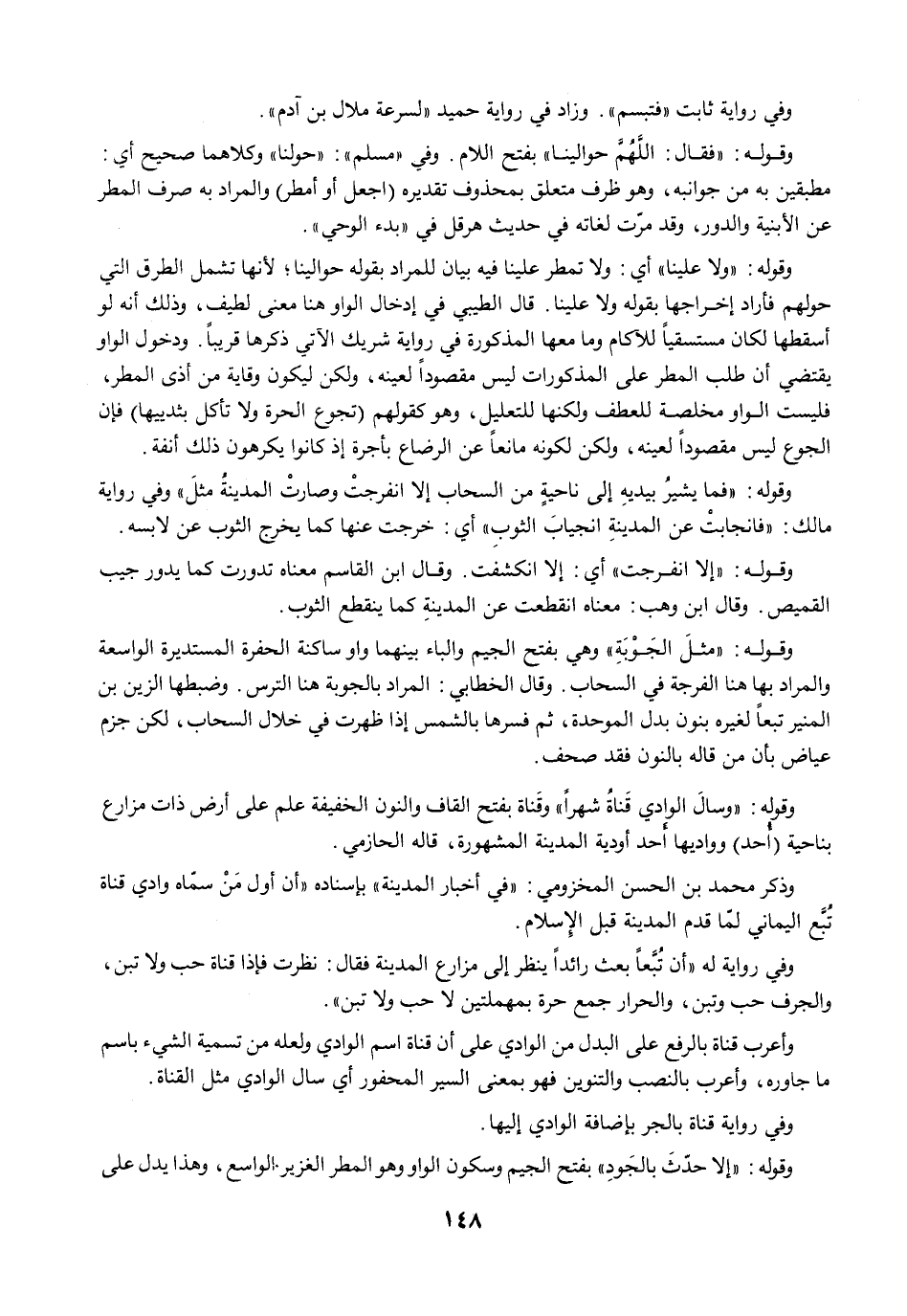 وقوله: "فقال: اللَّهُمَّ حوالينا" بفتح اللام. وفي "مسلم": "حولنا" وكلاهما صحيح أي: مطبقين به من جوانبه، وهو ظرف متعلق بمحذوف تقديره (اجعل أو أمطر) والمراد به صرف المطر عن الأبنية والدور، وقد مرّت لغاته في حديث هرقل في "بدء الوحي".