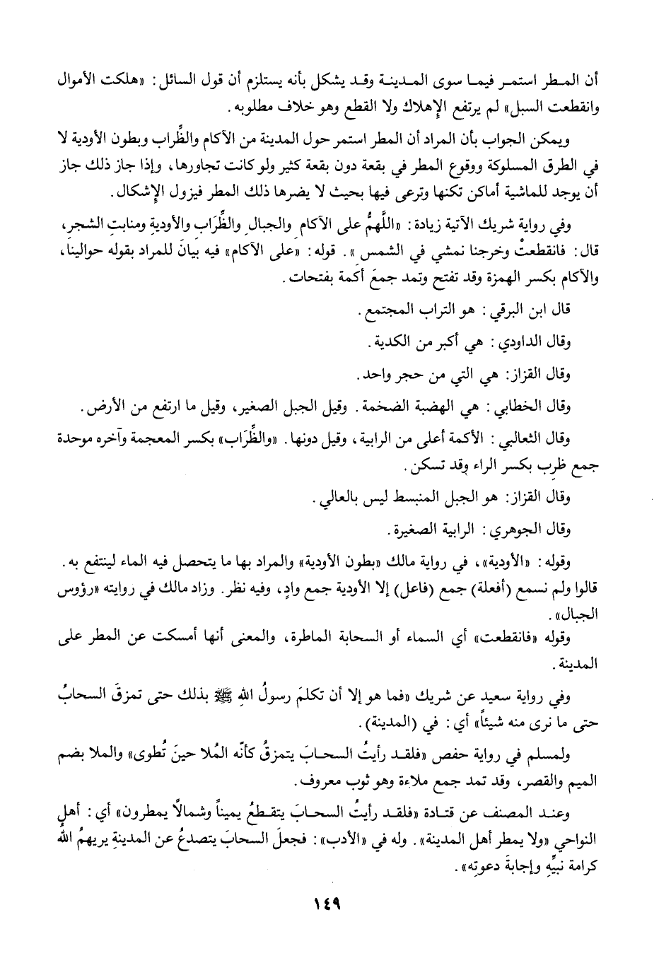 ويمكن الجواب بأن المراد أن المطر استمر حول المدينة من الآكام والظِّراب وبطون الأودية لا في الطرق المسلوكة ووقوع المطر في بقعة دون بقعة كثير ولو كانت تجاورها، وإذا جاز ذلك جاز أن يوجد للماشية أماكن تكنها وترعى فيها بحيث لا يضرها ذلك المطر فيزول الإشكال.