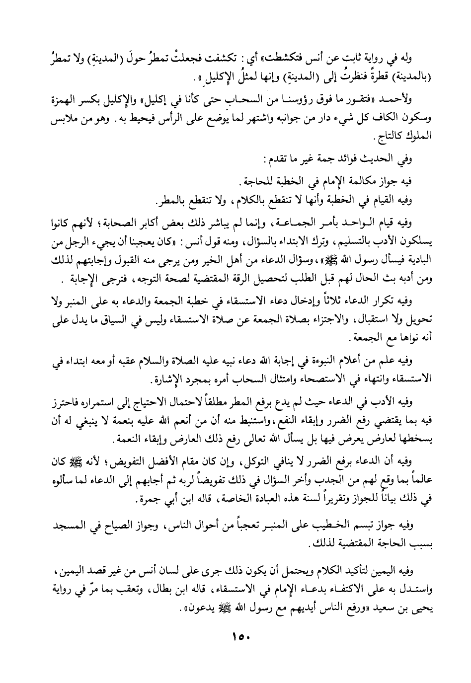 وفيه الأدب في الدعاء حيث لم يدع برفع المطر مطلقًا لاحتمال الاحتياج إلى استمراره فاحترز فيه بما يقتضي رفع الضرر وإبقاء النفع، واستنبط منه أن من أنعم الله عليه بنعمة لا ينبغي له أن يسخطها لعارض يعرض فيها بل يسأل الله تعالى رفع ذلك العارض وإبقاء النعمة.