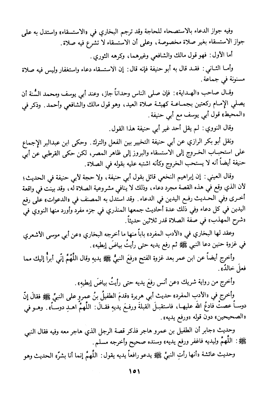 وعقد لها البخاري في "الأدب المفرد" بابًا منها ما أخرجه البخاري "عن أبي موسى الأشعري في غزوة حنين دعا النبي -صلى الله عليه وسلم- ثم رفع يديه حتى رأيتُ بياضَ إبطيه".