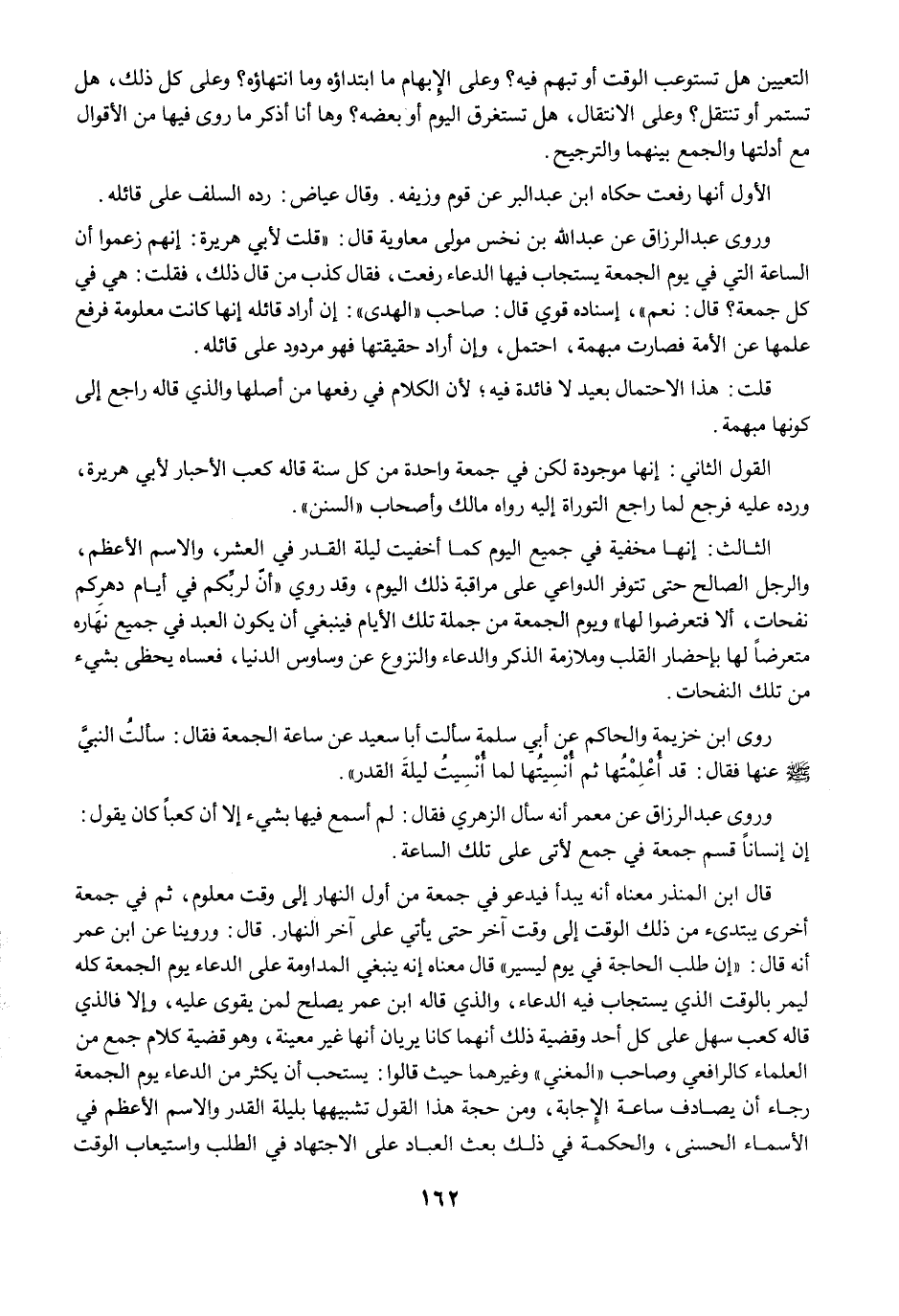 الثالث: إنها مخفية في جميع اليوم كما أخفيت ليلة القدر في العشر، والاسم الأعظم، والرجل الصالح حتى تتوفر الدواعي على مراقبة ذلك اليوم، وقد روي "أنّ لربِّكم في أيام دهرِكم نفحات، ألا فتعرضوا لها" ويوم الجمعة من جملة تلك الأيام فينبغي أن يكون العبد في جميع نهَاره متعرضًا لها بإحضار القلب وملازمة الذكر والدعاء والنزوع عن وساوس الدنيا، فعساه يحظى بشيء من تلك النفحات.