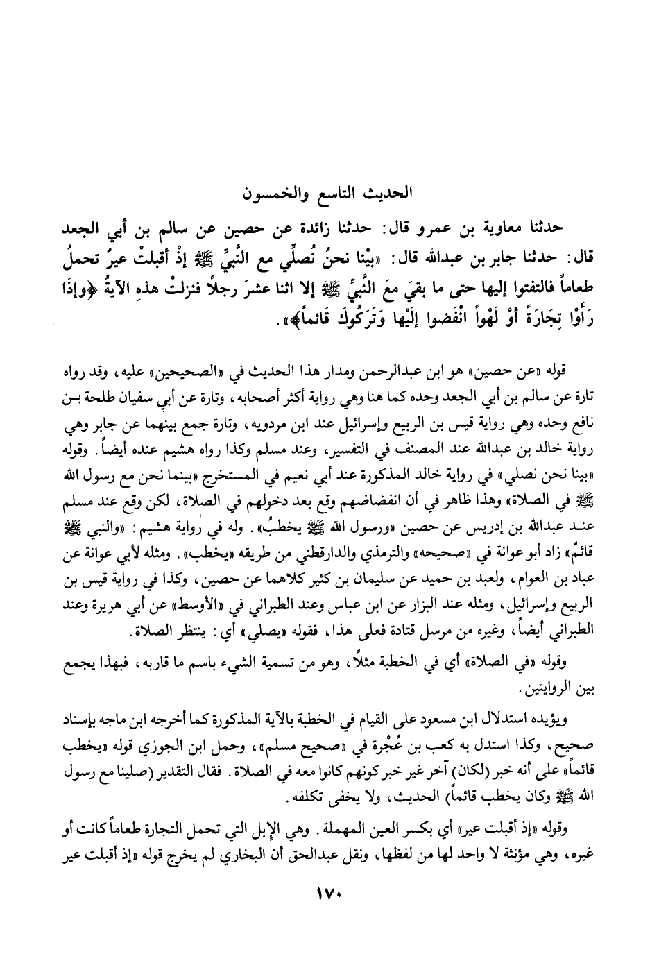 حَدَّثَنَا مُعَاوِيَةُ بْنُ عَمْرٍو قَالَ: حَدَّثَنَا زَائِدَةُ عَنْ حُصَيْنٍ عَنْ سَالِمِ بْنِ أَبِي الْجَعْدِ قَالَ: حَدَّثَنَا جَابِرُ بْنُ عَبْدِ اللَّهِ قَالَ: "بَيْنَمَا نَحْنُ نُصَلِّي مَعَ النَّبِيِّ -صلى الله عليه وسلم- إِذْ أَقْبَلَتْ عِيرٌ تَحْمِلُ طَعَامًا، فَالْتَفَتُوا إِلَيْهَا حَتَّى مَا بَقِيَ مَعَ النَّبِيِّ -صلى الله عليه وسلم- إِلاَّ اثْنَا عَشَرَ رَجُلاً، فَنَزَلَتْ هَذِهِ الآيَةُ {وَإِذَا رَأَوْا تِجَارَةً أَوْ لَهْوًا انْفَضُّوا إِلَيْهَا وَتَرَكُوكَ قَائِمًا} ".