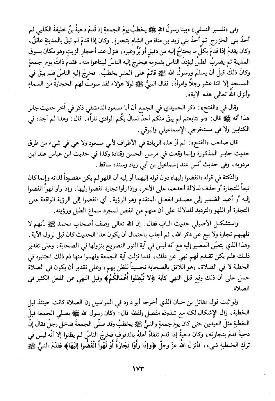 ولو ثبت قول مقاتل بن حيان الذي أخرجه أبو داود في المراسيل إن الصلاة كانت حينئذ قبل الخطبة، زال الإشكال لكنه مع شذوذه مفصل ولفظه قال: "كان رسول الله -صلى الله عليه وسلم- يصلي الجمعةَ قبلَ الخطبةِ مثلَ العيدين حتى كان يومَ جمعةٍ والنبيُّ -صلى الله عليه وسلم- يخطبُ وقد صلّى الجمعةَ فدخلَ رجلٌ فقالَ إنّ دحيةَ قدمَ بتجارتِه، وكان دحيةُ إذا قدم تلقاهُ أهلهُ بالدفوفِ فخرجَ الناسُ لم يظنوا إلا أنّه ليس في تركِ الخطبةِ شيء، فأنزلَ اللهُ عَزَّ وَجَلَّ {وَإِذَا رَأَوْا تِجَارَةً أَوْ لَهْوًا انْفَضُّوا إِلَيْهَا} فقدّمَ النبيُّ -صلى الله عليه وسلم-