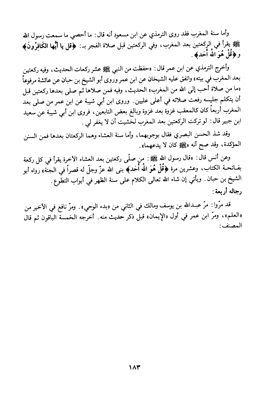 وأخرج الترمذي عن ابن عمر قال: "حفظت من النبي -صلى الله عليه وسلم- عشر ركعات الحديث، وفيه ركعتين بعد المغرب في بيته" واتفق عليه الشيخان عن ابن عمر وروى أبو الشيخ بن حبان عن عائشة مرفوعًا "ما من صلاة أحب إلى الله من المغرب" الحديث، وفيه فمن صلاها ثم صلى بعدها ركعتين قبل أن يتكلم جليسه رفعت صلاته في أعلى عليين. وروى ابن أبي شيبة عن ابن عمر من صلى بعد المغرب أربعًا كان كالمعقب غزوة بعد غزوة وبالغ بعض التابعين، فروى ابن أبي شيبة عن سعيد ابن جبير قال: لو تركت الركعتين بعد المغرب لخشيت أن لا يغفر لي.