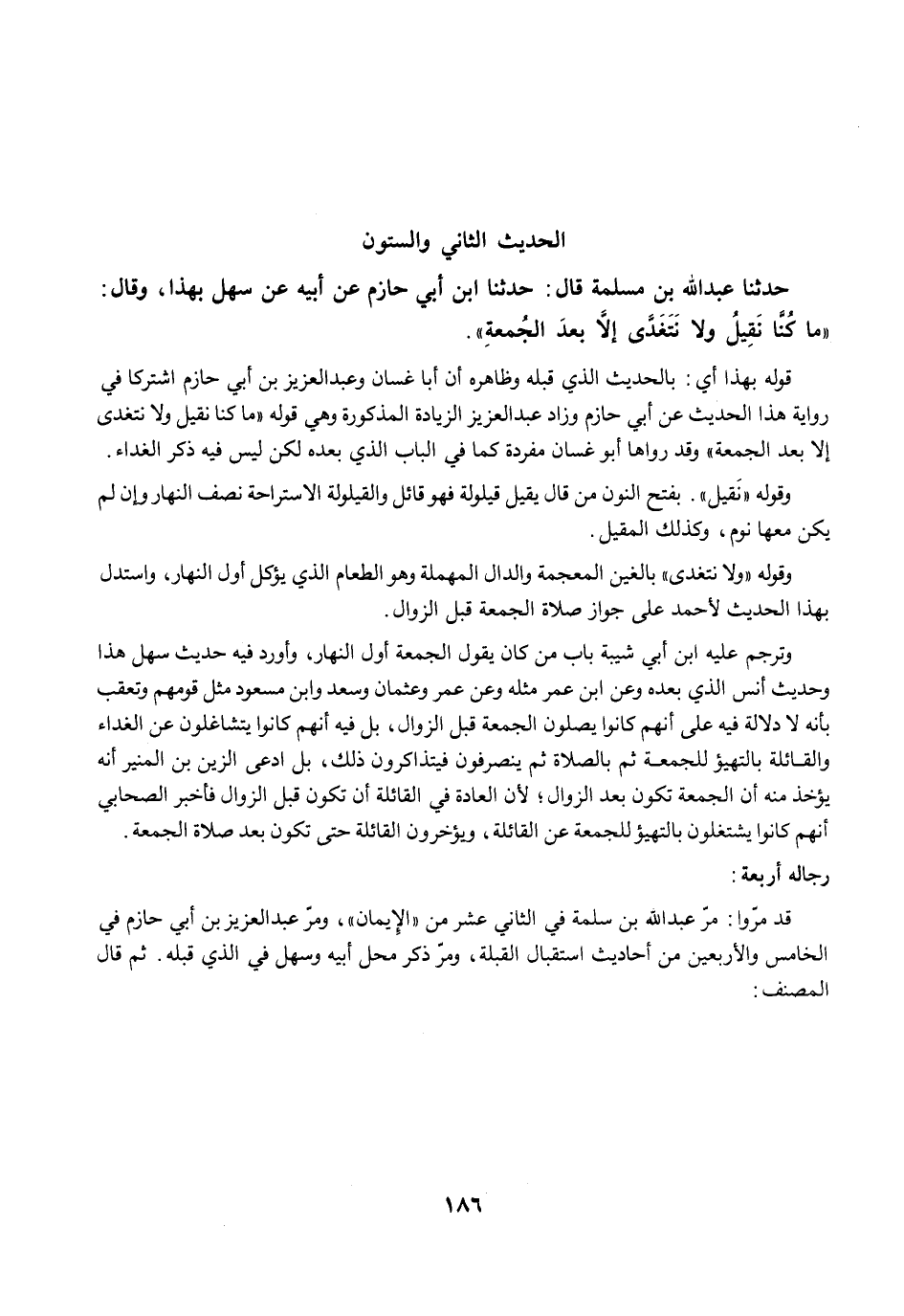 وترجم عليه ابن أبي شيبة باب من كان يقول الجمعة أول النهار، وأورد فيه حديث سهل هذا وحديث أنس الذي بعده وعن ابن عمر مثله وعن عمر وعثمان وسعد وابن مسعود مثل قومهم وتعقب بأنه لا دلالة يه على أنهم كانوا يصلون الجمعة قبل الزوال، بل فيه أنهم كانوا يتشاغلون عن الغداء والقائلة بالتهيؤ للجمعة ثم بالصلاة ثم ينصرفون فيتذاكرون ذلك، بل ادعى الزين بن المنير أنه يؤخذ منه أن الجمعة تكون بعد الزوال؛ لأن العادة في القائلة أن تكون قبل الزوال فأخبر الصحابي أنهم كانوا يشتغلون بالتهيؤ للجمعة عن القائلة، ويؤخرون القائلة حتى تكون بعد صلاة الجمعة.