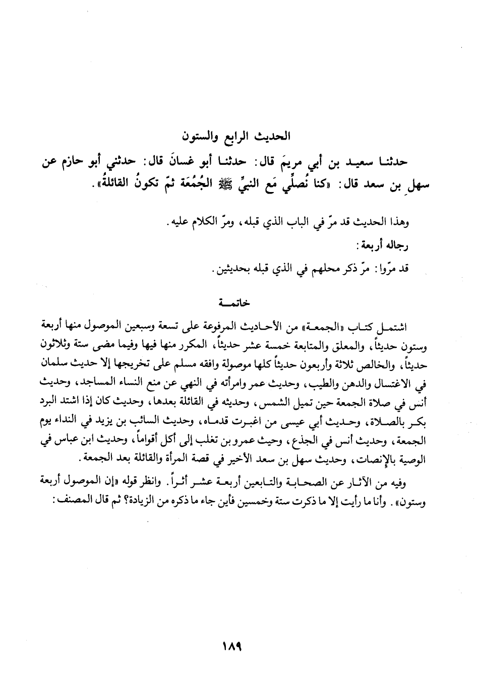 حَدَّثَنَا سَعِيدُ بْنُ أَبِي مَرْيَمَ قَالَ: حَدَّثَنَا أَبُو غَسَّانَ قَالَ: حَدَّثَنِي أَبُو حَازِمٍ عَنْ سَهْلٍ بن سعد قَالَ: "كُنَّا نُصَلِّي مَعَ النَّبِيِّ -صلى الله عليه وسلم- الْجُمُعَةَ ثُمَّ تَكُونُ الْقَائِلَةُ".
