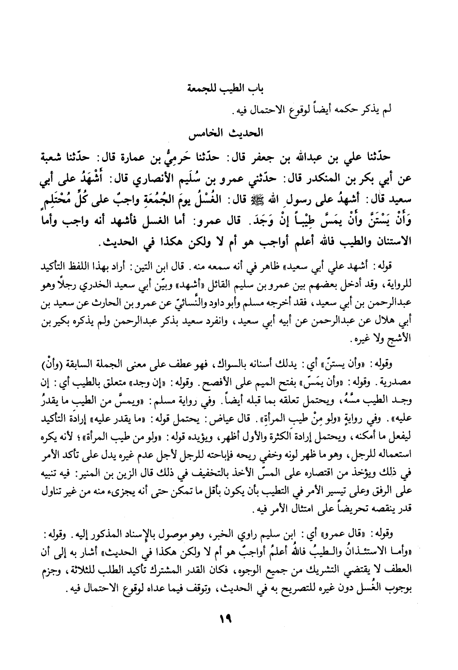 حَدَّثَنَا عَلِيٌّ بن عبد الله بن جعفر قَالَ: حَدَّثَنَا حَرَمِيُّ بْنُ عُمَارَةَ قَالَ: حَدَّثَنَا شُعْبَةُ عَنْ أَبِي بَكْرِ بْنِ الْمُنْكَدِرِ قَالَ: حَدَّثَنِي عَمْرُو بْنُ سُلَيْمٍ الأَنْصَارِيُّ قَالَ: أَشْهَدُ عَلَى أَبِي سَعِيدٍ قَالَ: أَشْهَدُ عَلَى رَسُولِ اللَّهِ -صلى الله عليه وسلم- قَالَ: الْغُسْلُ يَوْمَ الْجُمُعَةِ وَاجِبٌ عَلَى كُلِّ مُحْتَلِمٍ، وَأَنْ يَسْتَنَّ وَأَنْ يَمَسَّ طِيبًا إِنْ وَجَدَ. قَالَ عَمْرو: أَمَّا الْغُسْلُ فَأَشْهَدُ أَنَّهُ وَاجِبٌ، وَأَمَّا الاِسْتِنَانُ وَالطِّيبُ فَاللَّهُ أَعْلَمُ أَوَاجِبٌ هُوَ أَمْ لاَ، وَلَكِنْ هَكَذَا فِي الْحَدِيثِ.