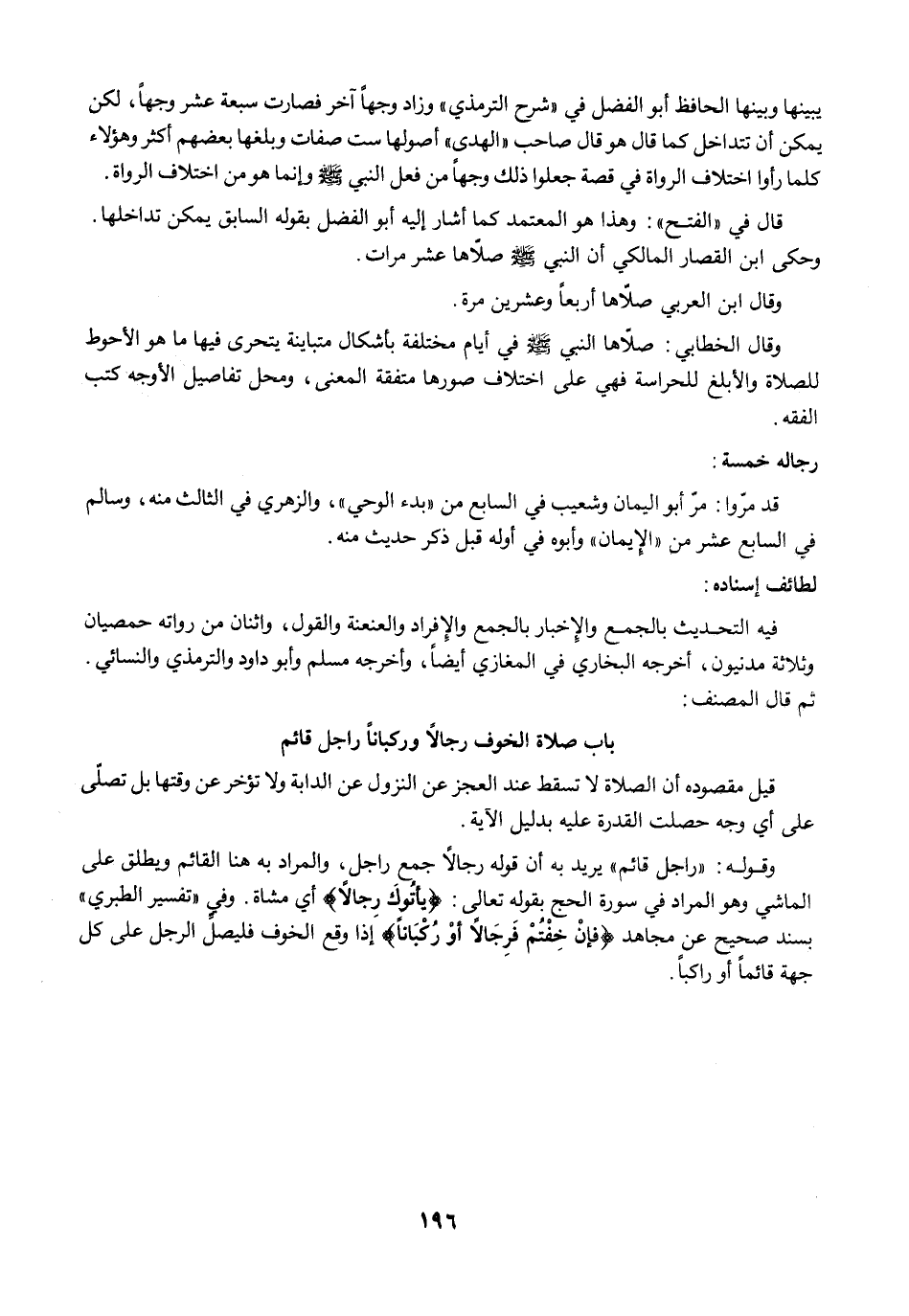 يبينها وبينها الحافظ أبو الفضل في "شرح الترمذي" وزاد وجهًا آخر فصارت سبعة عشر وجهًا، لكن يمكن أن تتداخل كما قال هو قال صاحب "الهدى" أصولها ست صفات وبلغها بعضهم أكثر وهؤلاء كلما رأوا اختلاف الرواة في قصة جعلوا ذلك وجهًا من فعل النبي -صلى الله عليه وسلم- وإنما هو من اختلاف الرواة.