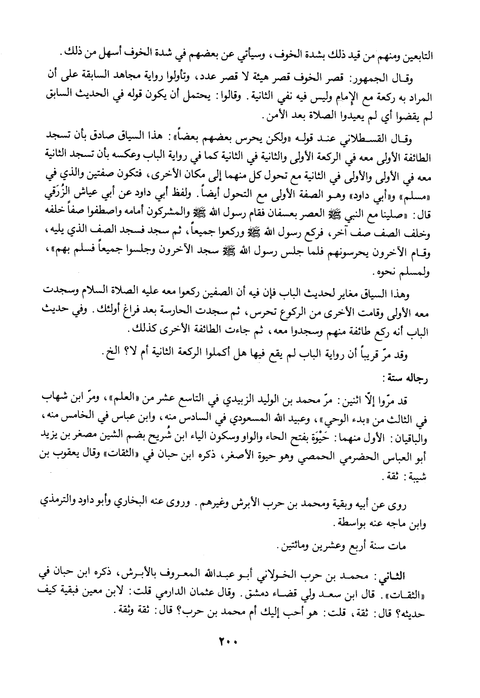 وقال القسطلاني عند قوله "ولكن يحرس بعضهم بعضًا": هذا السياق صادق بأن تسجد الطائفة الأولى معه في الركعة الأولى والثانية في الثانية كما في رواية الباب وعكسه بأن تسجد الثانية معه في الأولى والأولى في الثانية مع تحول كل منهما إلى مكان الأخرى، فتكون صفتين والذي في "مسلم" و"أبي داود" وهو الصفة الأولى مع التحول أيضًا. ولفظ أبي داود عن أبي عياش الزُرَقي قال: "صلينا مع النبي -صلى الله عليه وسلم- العصر بعسفان فقام رسول الله -صلى الله عليه وسلم- والمشركون أمامه واصطفوا صفًا خلفه وخلف الصف صف آخر، فركع رسول الله -صلى الله عليه وسلم- وركعوا جميعًا، ثم سجد فسجد الصف الذي يليه، وقام الآخرون يحرسونهم فلما جلس رسول الله -صلى الله عليه وسلم- سجد الآخرون وجلسوا جميعًا فسلم بهم"، ولمسلم نحوه.