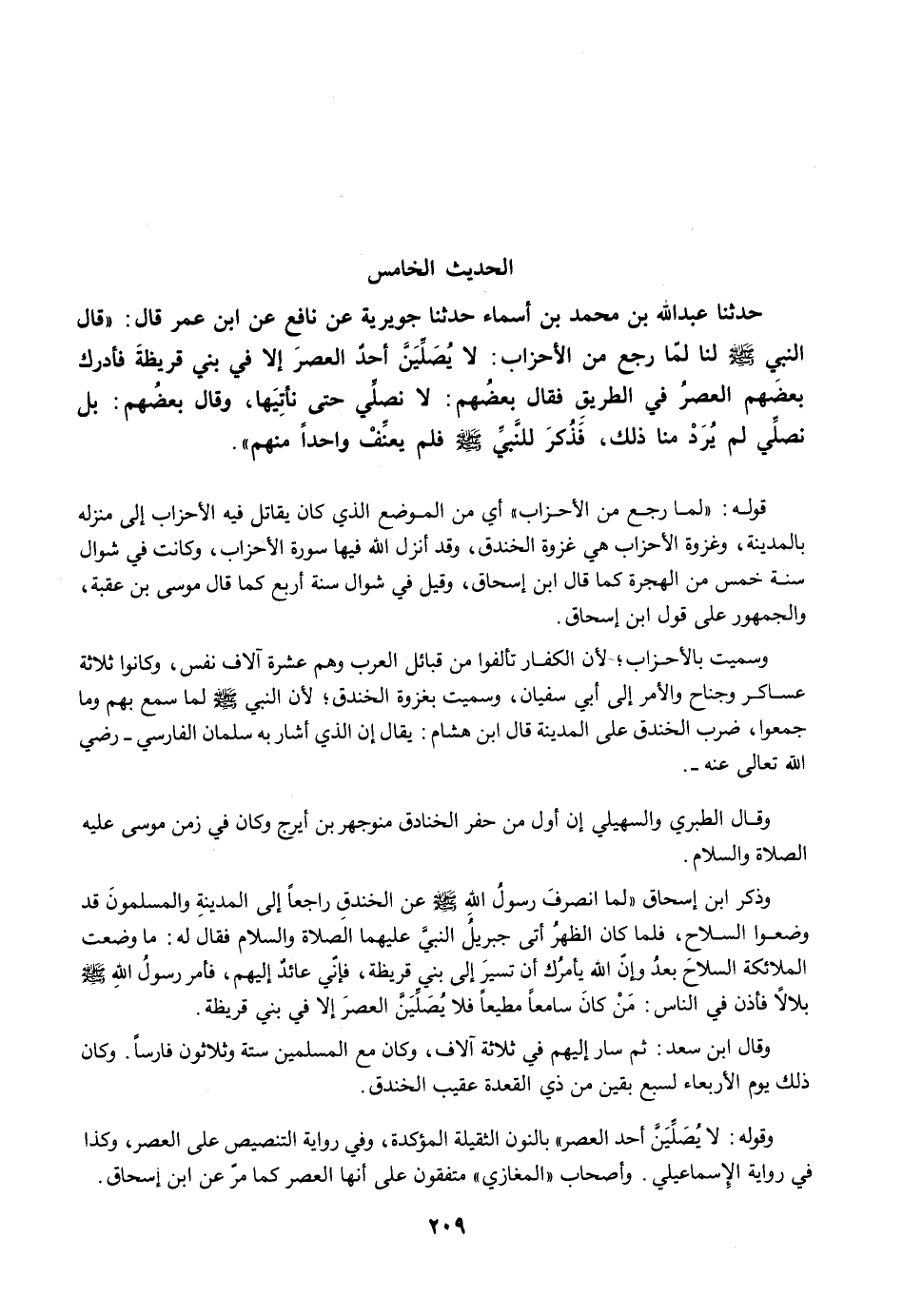 حَدَّثَنَا عَبْدُ اللَّهِ بْنُ مُحَمَّدِ بْنِ أَسْمَاءَ قَالَ حَدَّثَنَا جُوَيْرِيَةُ عَنْ نَافِعٍ عَنِ ابْنِ عُمَرَ قَالَ: "قَالَ النَّبِيُّ -صلى الله عليه وسلم- لَنَا لَمَّا رَجَعَ مِنَ الأَحْزَابِ: لاَ يُصَلِّيَنَّ أَحَدٌ الْعَصْرَ إِلاَّ فِي بَنِي قُرَيْظَةَ. فَأَدْرَكَ بَعْضُهُمُ الْعَصْرَ فِي الطَّرِيقِ فَقَالَ بَعْضُهُمْ: لاَ نُصَلِّي حَتَّى نَأْتِيَهَا، وَقَالَ بَعْضُهُمْ: بَلْ نُصَلِّي لَمْ يُرَدْ مِنَّا ذَلِكَ. فَذُكِرَ لِلنَّبِىِّ -صلى الله عليه وسلم- فَلَمْ يُعَنِّفْ وَاحِدًا مِنْهُمْ".
