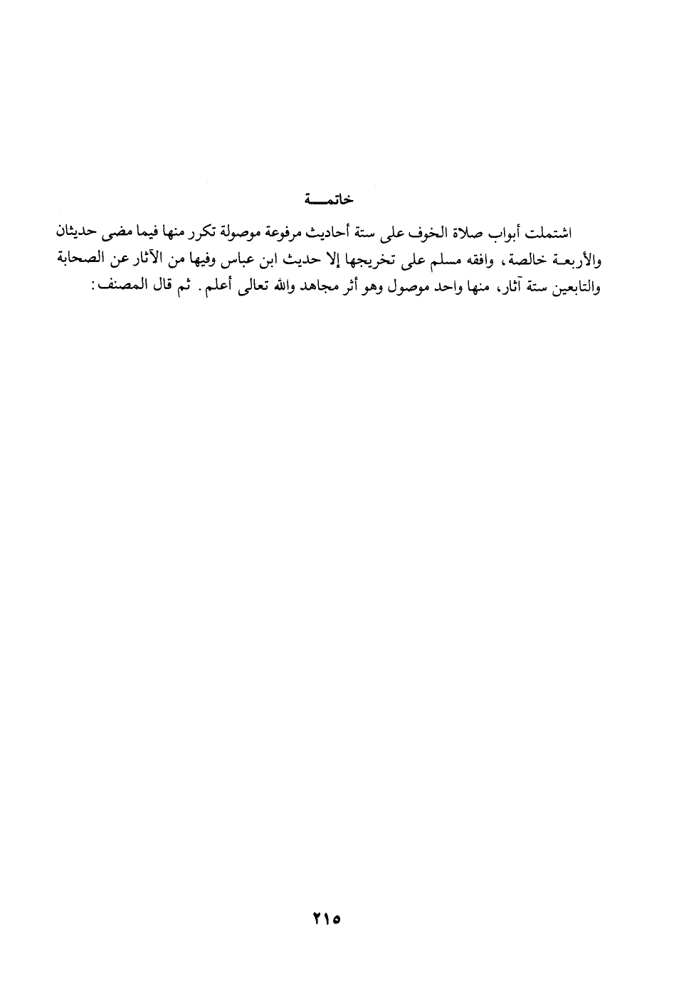 اشتملت أبواب صلاة الخوف على ستة أحاديث مرفوعة موصولة تكرر منها فيما مضى حديثان والأربعة خالصة، وافقه مسلم على تخريجها إلا حديث ابن عباس وفيها من الآثار عن الصحابة والتابعين ستة آثار، منها واحد موصول وهو أثر مجاهد والله تعالى أعلم. ثم قال المصنف: