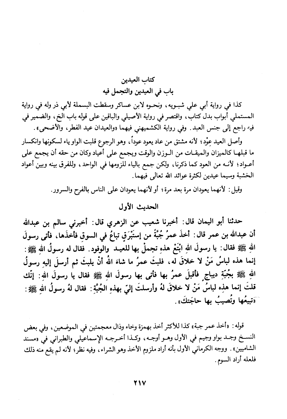 حَدَّثَنَا أَبُو الْيَمَانِ قَالَ: أَخْبَرَنَا شُعَيْبٌ عَنِ الزُّهْرِيِّ قَالَ: أَخْبَرَنِي سَالِمُ بْنُ عَبْدِ اللَّهِ أَنَّ عَبْدَ اللَّهِ بْنَ عُمَرَ قَالَ: أَخَذَ عُمَرُ جُبَّةً مِنْ إِسْتَبْرَقٍ تُبَاعُ فِي السُّوقِ، فَأَخَذَهَا فَأَتَى رَسُولَ اللَّهِ -صلى الله عليه وسلم- فَقَالَ: يَا رَسُولَ اللَّهِ ابْتَعْ هَذِهِ تَجَمَّلْ بِهَا لِلْعِيدِ وَالْوُفُودِ. فَقَالَ لَهُ رَسُولُ اللَّهِ -صلى الله عليه وسلم-: إِنَّمَا هَذِهِ لِبَاسُ مَنْ لاَ خَلاَقَ لَهُ. فَلَبِثَ عُمَرُ مَا شَاءَ اللَّهُ أَنْ يَلْبَثَ، ثُمَّ أَرْسَلَ إِلَيْهِ رَسُولُ اللَّهِ -صلى الله عليه وسلم- بِجُبَّةِ دِيبَاجٍ، فَأَقْبَلَ بِهَا عُمَرُ، فَأَتَى بِهَا رَسُولَ اللَّهِ -صلى الله عليه وسلم- فَقَالَ يَا رَسُولَ اللَّهِ: إِنَّكَ قُلْتَ إِنَّمَا هَذِهِ لِبَاسُ مَنْ لاَ خَلاَقَ لَهُ. وَأَرْسَلْتَ إِلَيَّ بِهَذِهِ الْجُبَّةِ فَقَالَ لَهُ رَسُولُ اللَّهِ -صلى الله عليه وسلم-: تَبِيعُهَا أَوْ تُصِيبُ بِهَا حَاجَتَكَ.