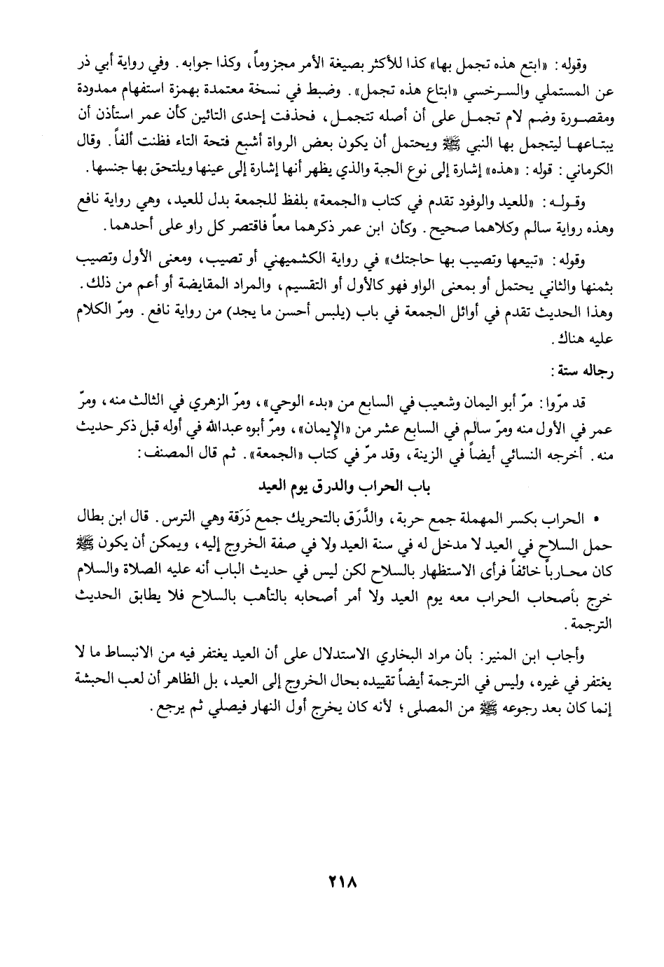 وأجاب ابن المنير: بأن مراد البخاري الاستدلال على أن العيد يغتفر فيه من الانبساط ما لا يغتفر في غيره، وليس في الترجمة أيضًا تقييده بحال الخروج إلى العيد، بل الظاهر أن لعب الحبشة إنما كان بعد رجوعه -صلى الله عليه وسلم- من المصلى؛ لأنه كان يخرج أول النهار فيصلي ثم يرجع.