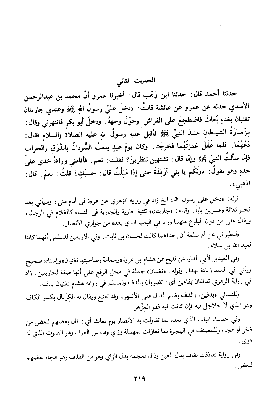 حَدَّثَنَا أَحْمَدُ قَالَ: حَدَّثَنَا ابْنُ وَهْبٍ قَالَ: أَخْبَرَنَا عَمْرٌو أَنَّ مُحَمَّدَ بْنَ عَبْدِ الرَّحْمَنِ الأَسَدِيَّ حَدَّثَهُ عَنْ عُرْوَةَ عَنْ عَائِشَةَ قَالَتْ: "دَخَلَ عَلَيَّ رَسُولُ اللَّهِ -صلى الله عليه وسلم- وَعِنْدِي جَارِيَتَانِ تُغَنِّيَانِ بِغِنَاءِ بُعَاثَ، فَاضْطَجَعَ عَلَى الْفِرَاشِ وَحَوَّلَ وَجْهَهُ، وَدَخَلَ أَبُو بَكْرٍ فَانْتَهَرَنِي وَقَالَ: مِزْمَارَةُ الشَّيْطَانِ عِنْدَ النَّبِيِّ -صلى الله عليه وسلم- فَأَقْبَلَ عَلَيْهِ رَسُولُ اللَّهِ عَلَيْهِ الصلاة والسَّلاَمُ فَقَالَ: دَعْهُمَا. فَلَمَّا غَفَلَ غَمَزْتُهُمَا فَخَرَجَتَا. وَكَانَ يَوْمَ عِيدٍ يَلْعَبُ السُّودَانُ بِالدَّرَقِ وَالْحِرَابِ، فَإِمَّا سَأَلْتُ النَّبِيَّ -صلى الله عليه وسلم- وَإِمَّا قَالَ: تَشْتَهِينَ تَنْظُرِينَ؟. فَقُلْتُ: نَعَمْ. فَأَقَامَنِي وَرَاءَهُ خَدِّي عَلَى خَدِّهِ، وَهُوَ يَقُولُ: دُونَكُمْ يَا بَنِي أَرْفِدَةَ. حَتَّى إِذَا مَلِلْتُ قَالَ: حَسْبُكِ؟. قُلْتُ: نَعَمْ. قَالَ: فَاذْهَبِي".