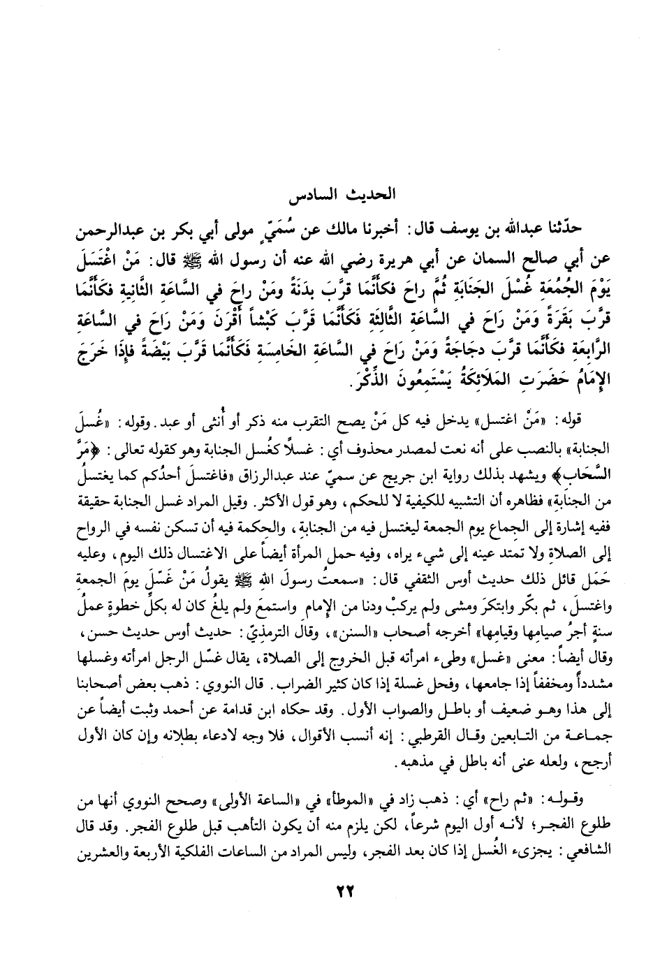 حَدَّثَنَا عَبْدُ اللَّهِ بْنُ يُوسُفَ قَالَ: أَخْبَرَنَا مَالِكٌ عَنْ سُمَيٍّ مَوْلَى أَبِي بَكْرِ بْنِ عَبْدِ الرَّحْمَنِ عَنْ أَبِي صَالِحٍ السَّمَّانِ عَنْ أَبِي هُرَيْرَةَ رضي الله عنه أَنَّ رَسُولَ اللَّهِ -صلى الله عليه وسلم- قَالَ: مَنِ اغْتَسَلَ يَوْمَ الْجُمُعَةِ غُسْلَ الْجَنَابَةِ ثُمَّ رَاحَ فَكَأَنَّمَا قَرَّبَ بَدَنَةً، وَمَنْ رَاحَ فِي السَّاعَةِ الثَّانِيَةِ فَكَأَنَّمَا قَرَّبَ بَقَرَةً، وَمَنْ رَاحَ فِي السَّاعَةِ الثَّالِثَةِ فَكَأَنَّمَا قَرَّبَ كَبْشًا أَقْرَنَ، وَمَنْ رَاحَ فِي السَّاعَةِ الرَّابِعَةِ فَكَأَنَّمَا قَرَّبَ دَجَاجَةً، وَمَنْ رَاحَ فِي السَّاعَةِ الْخَامِسَةِ فَكَأَنَّمَا قَرَّبَ بَيْضَةً، فَإِذَا خَرَجَ الإِمَامُ حَضَرَتِ الْمَلاَئِكَةُ يَسْتَمِعُونَ الذِّكْرَ.