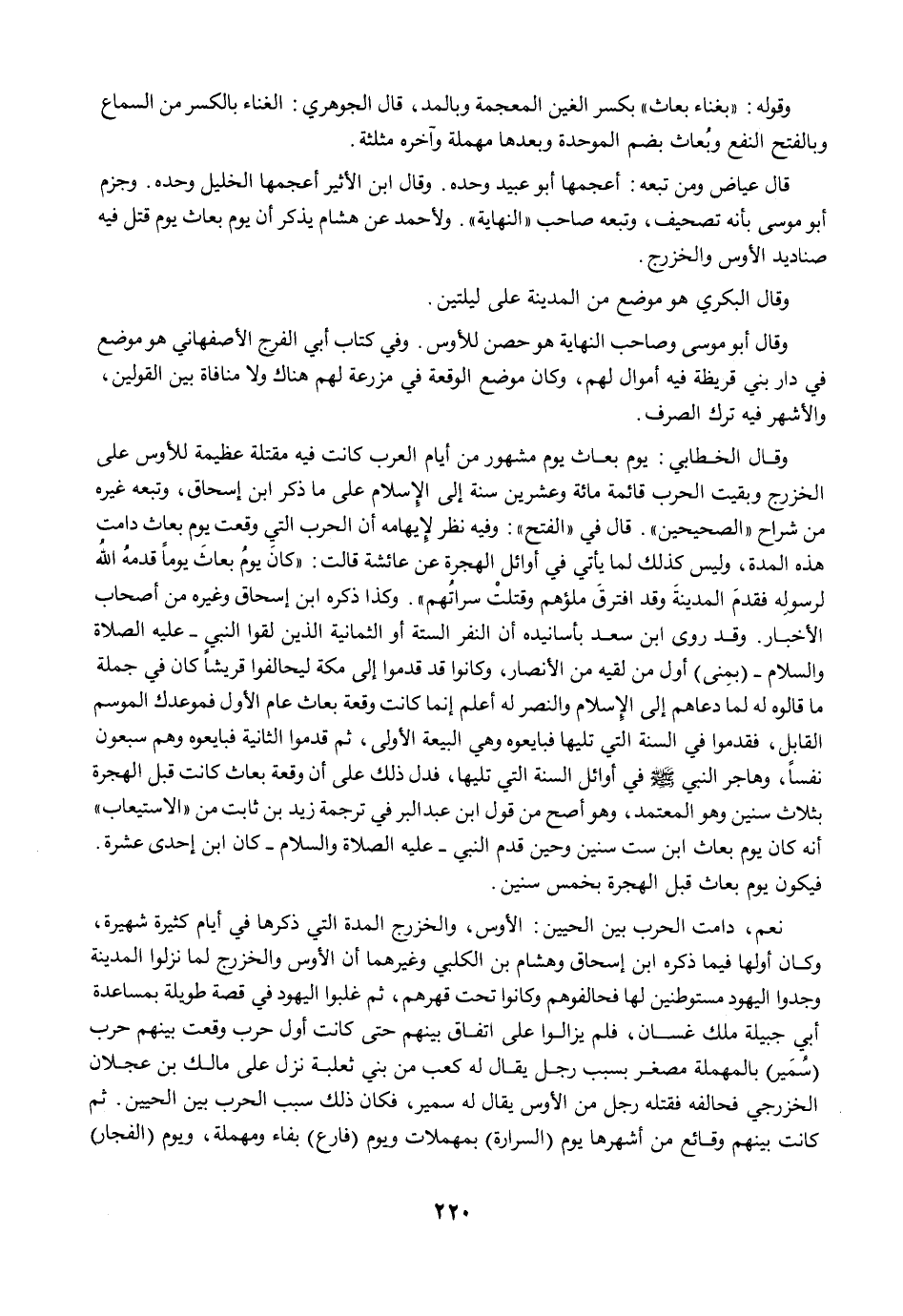 قال عياض ومن تبعه: أعجمها أبو عبيد وحده. وقال ابن الأثير أعجمها الخليل وحده. وجزم أبو موسى بأنه تصحيف، وتبعه صاحب "النهاية". ولأحمد عن هشام يذكر أن يوم بعاث يوم قتل فيه صناديد الأوس والخزرج.