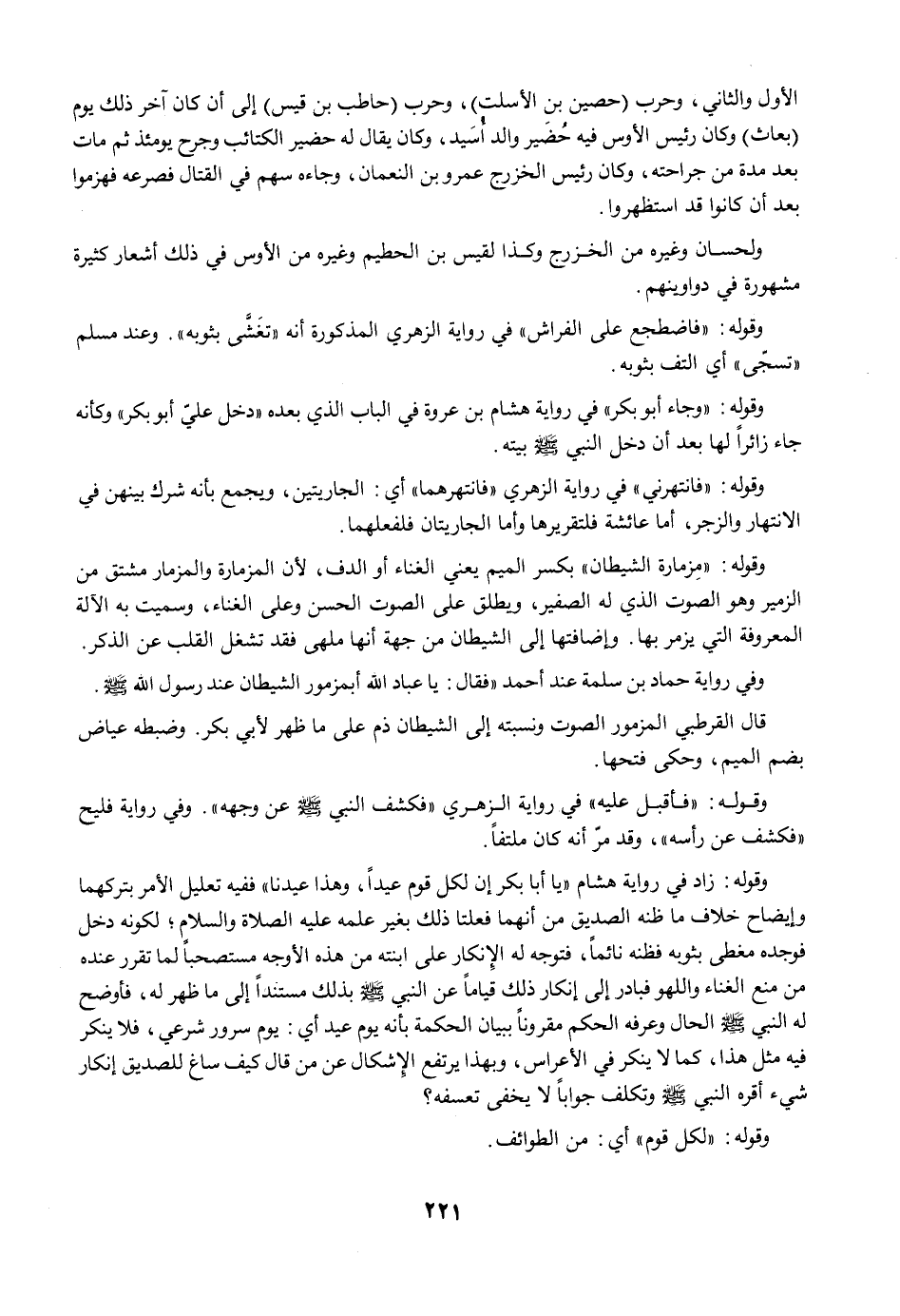 وقوله: زاد في رواية هشام "يا أبا بكر إن لكل قوم عيدًا، وهذا عيدنا" ففيه تعليل الأمر بتركهما وإيضاح خلاف ما ظنه الصديق من أنهما فعلتا ذلك بغير علمه عليه الصلاة والسلام؛ لكونه دخل فوجده مغطى بثوبه فظنه نائمًا، فتوجه له الإنكار على ابنته من هذه الأوجه مستصحبا لما تقرر عنده من منع الغناء واللهو فبادر إلى إنكار ذلك قيامًا عن النبي -صلى الله عليه وسلم- بذلك مستندًا إلى ما ظهر له، فأوضح له النبي -صلى الله عليه وسلم- الحال وعرفه الحكم مقرونًا ببيان الحكمة بأنه يوم عيد أي: يوم سرور شرعي، فلا ينكر فيه مثل هذا، كما لا ينكر في الأعراس، وبهذا يرتفع الإشكال عن من قال كيف ساغ للصديق إنكار شيء أقره النبي -صلى الله عليه وسلم- وتكلف جوابًا لا يخفى تعسفه؟