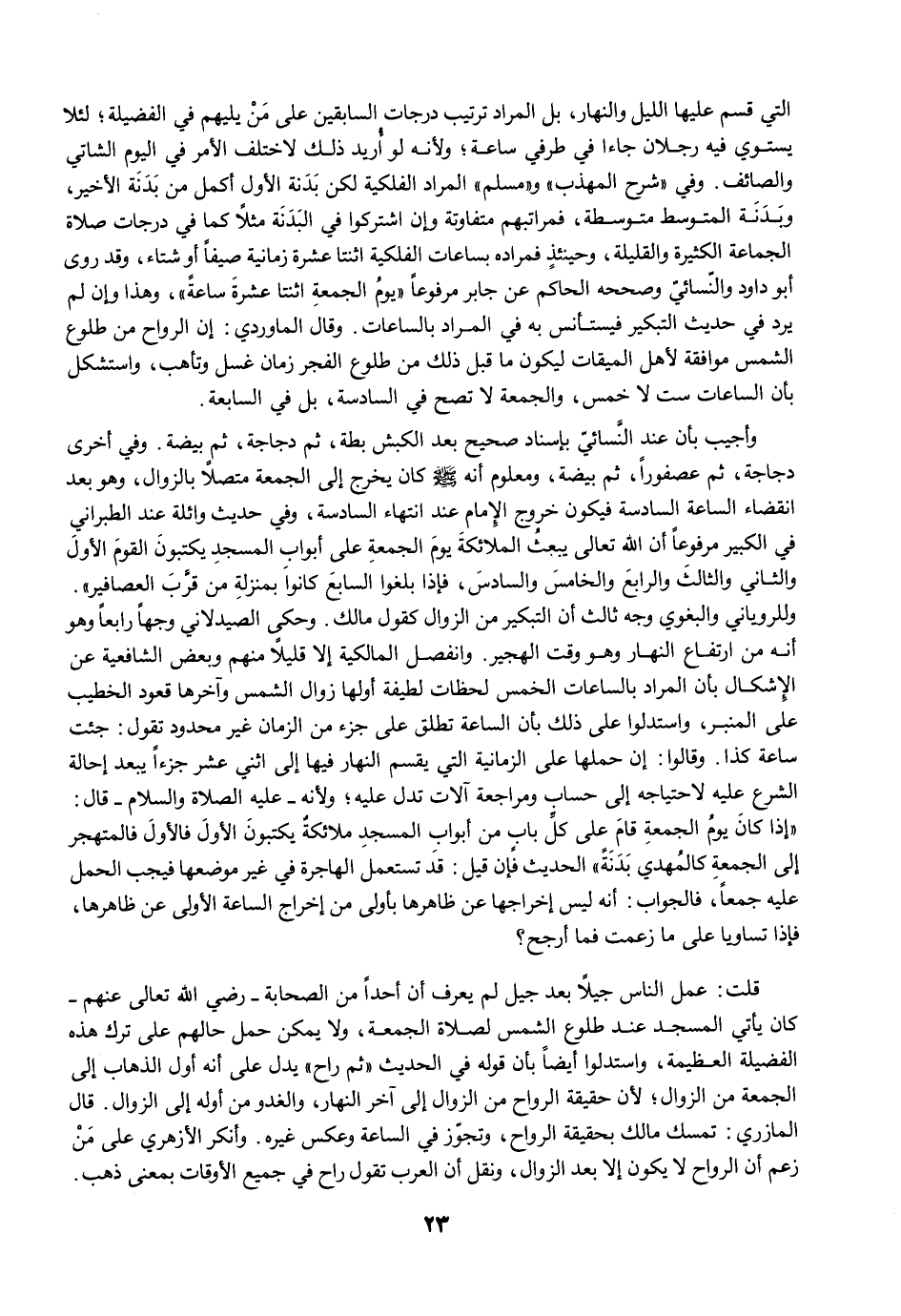 وأجيب بأن عند النَّسائيّ بإسناد صحيح بعد الكبش بطة، ثم دجاجة، ثم بيضة. وفي أخرى دجاجة، ثم عصفورًا، ثم بيضة، ومعلوم أنه -صلى الله عليه وسلم- كان يخرج إلى الجمعة متصلًا بالزوال، وهو بعد انقضاء الساعة السادسة فيكون خروج الإمام عند انتهاء السادسة، وفي حديث وائلة عند الطبراني في الكبير مرفوعًا أن الله تعالى يبعث الملائكةَ يومَ الجمعةِ على أبواب المسجدِ يكتبونَ القومَ الأولَ والثاني والثالثَ والرابعَ والخامسَ والسادسَ، فإذا بلغوا السابعَ كانواَ بمنزلةِ من قرَّبَ العصافير". وللروياني والبغوي وجه ثالث أن التبكير من الزوال كقول مالك. وحكى الصيدلاني وجهًا رابعًا وهو أنه من ارتفاع النهار وهو وقت الهجير. وانفصل المالكية إلا قليلًا منهم وبعض الشافعية عن الإِشكال بأن المراد بالساعات الخمس لحظات لطيفة أولها زوال الشمس وآخرها قعود الخطيب على المنبر، واستدلوا على ذلك بأن الساعة تطلق على جزء من الزمان غير محدود تقول: جئت ساعة كذا. وقالوا: إن حملها على الزمانية التي يقسم النهار فيها إلى اثني عشر جزءًا يبعد إحالة الشرع عليه لاحتياجه إلى حساب ومراجعة آلات تدل عليه؛ ولأنه -عليه الصلاة والسلام- قال: "إِذا كانَ يومُ الجمعةِ قامَ على كلِّ بابٍ من أبوابِ المسجدِ ملائكةٌ يكتبونَ الأولَ فالأولَ فالمتهجر إلى الجمعةِ كالمُهدي بَدَنَةً" الحديث فإن قيل: قد تستعمل الهاجرة في غير موضعها فيجب العمل عليه جمعًا، فالجواب: أنه ليس إخراجها عن ظاهرها بأولى من إخراج الساعة الأولى عن ظاهرها، فإذا تساويا على ما زعمت فما أرجح؟