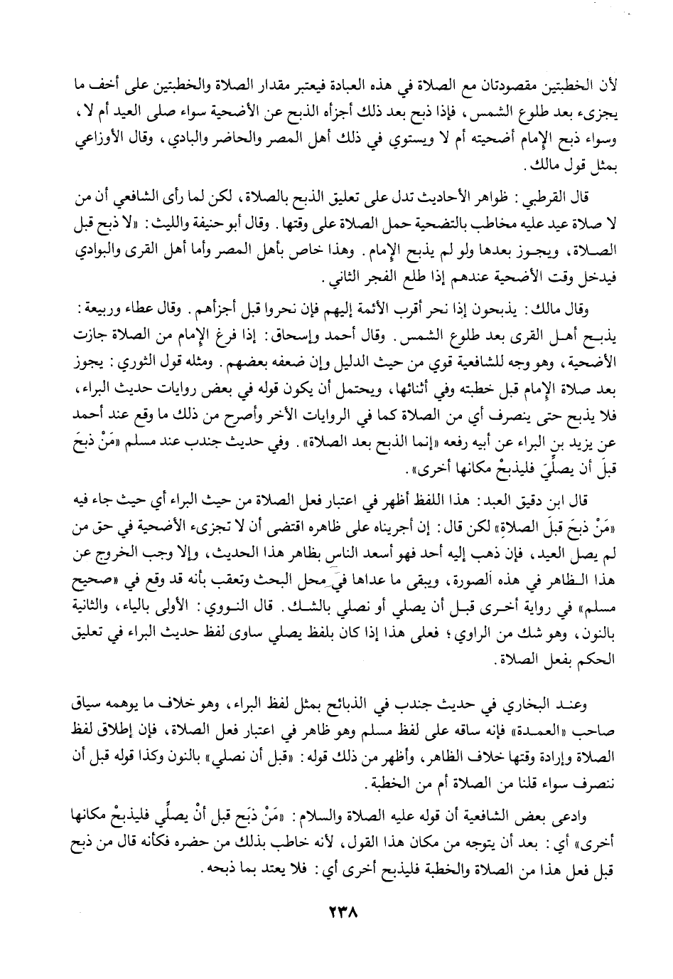 قال ابن دقيق العبد: هذا اللفظ أظهر في اعتبار فعل الصلاة من حيث البراء أي حيث جاء فيه "مَنْ ذبحَ قبلَ الصلاةِ" لكن قال: إن أجريناه على ظاهره اقتضى أن لا تجزىء الأضحية في حق من لم يصل العيد، فإن ذهب إليه أحد فهو أسعد الناس بظاهر هذا الحديث، وإلا وجب الخروج عن هذا الظاهر في هذه الصورة، ويبقى ما عداها في محل البحث وتعقب بأنه قد وقع في "صحيح مسلم" في ش واية أخرى قبل أن يصلي أو نصلي بالشك. قال النووي: الأولى بالياء، والثانية بالنون، وهو شك من الراوي؛ فعلى هذا إذا كان بلفظ يصلي ساوى لفظ حديث البراء في تعليق الحكم بفعل الصلاة.