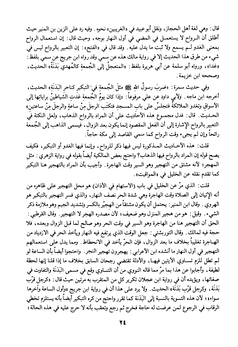 قلت: هذه الأحاديث المذكورة ليس فيها ذكر للرواح، وإنما فيها الغدو أو التبكير، فكيف يصح قوله إن المراد بالرواح فيها الذهاب؟ واحتج بعض المالكية أيضًا بقوله في رواية الزهري: مثل المهجر؛ لأنه مشتق من التهجير وهو السير وقت الهاجرة. وأجيب بأن المراد بالتهجير هنا التبكير كما تقدم نقله عن الخليل في "المواقيت".