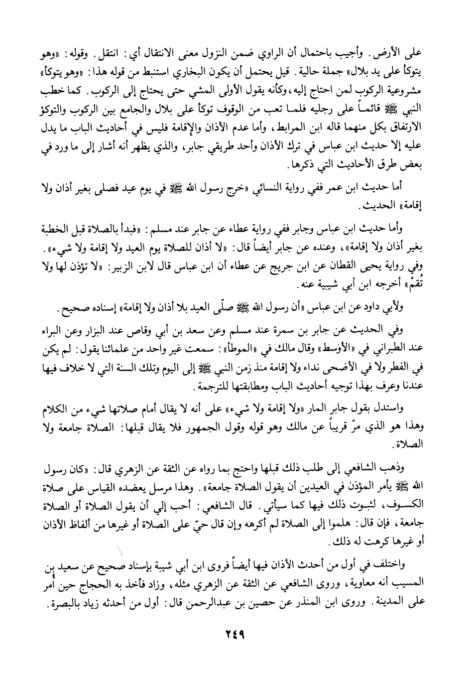 وذهب الشافعي إلى طلب ذلك قبلها واحتج بما رواه عن الثقة عن الزهري قال: "كان رسول الله -صلى الله عليه وسلم- يأمر المؤذن في العيدين أن يقول الصلاة جامعة". وهذا مرسل يعضده القياس على صلاة الكسوف، لثبوت ذلك فيها كما سيأتي. قال الشافعي: أحب إلى أن يقول الصلاة أو الصلاة جامعة، فإن قال: هلموا إلى الصلاة لم أكرهه وإن قال حيّ على الصلاة أو غيرها من ألفاظ الأذان أو غيرها كرهت له ذلك.