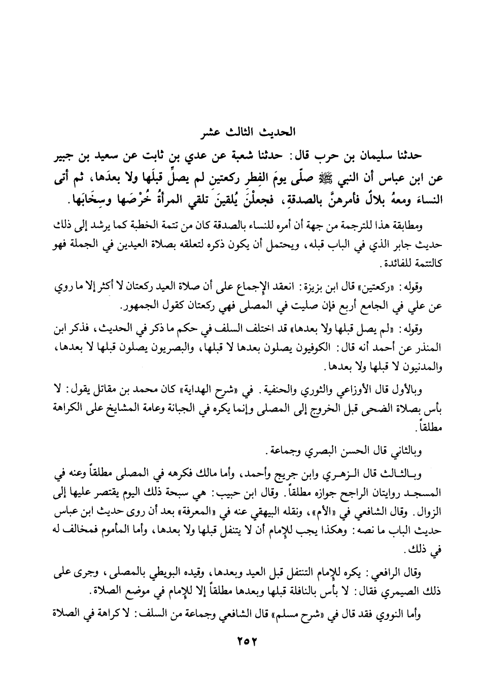 حَدَّثَنَا سُلَيْمَانُ بْنُ حَرْبٍ قَالَ: حَدَّثَنَا شُعْبَةُ عَنْ عَدِيِّ بْنِ ثَابِتٍ عَنْ سَعِيدِ بْنِ جُبَيْرٍ عَنِ ابْنِ عَبَّاسٍ أَنَّ النَّبِيَّ -صلى الله عليه وسلم- صَلَّى يَوْمَ الْفِطْرِ رَكْعَتَيْنِ، لَمْ يُصَلِّ قَبْلَهَا وَلاَ بَعْدَهَا، ثُمَّ أَتَى النِّسَاءَ وَمَعَهُ بِلاَلٌ، فَأَمَرَهُنَّ بِالصَّدَقَةِ، فَجَعَلْنَ يُلْقِينَ، تُلْقِي الْمَرْأَةُ خُرْصَهَا وَسِخَابَهَا.