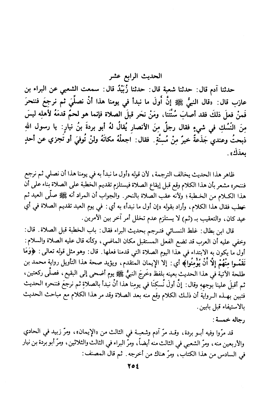 قال ابن بطال: غلط النسائي فترجم بحديث البراء فقال: باب الخطبة قبل الصلاة. قال: وخفي عليه أن العرب قد تضع الفعل المستقبل مكان الماضي، وكأنه قال عليه الصلاة والسلام: أول ما يكون به الابتداء في هذا اليوم الصلاة التي قدمنا فعلها. قال: وهو مثل قوله تعالى: {وَمَا نَقَمُوا مِنْهُمْ إِلَّا أَنْ يُؤْمِنُوا} أي: إلا الإيمان المتقدم، ويؤيد صحة هذا التأويل رواية محمد بن طلحة الآتية في هذا الحديث بعينه بلفظ "خَرجَ النبيُّ -صلى الله عليه وسلم- يوم أضحى إلى البقيع، فصلَّى ركعتين، ثم أقبلَ علينا بوجههِ وقال: إنَّ أولَ نُسكِنَا في يومِنا هذا أنْ نبدأ بالصلاةِ ثم نرجعَ فننحر" الحديث فتبين بهذه الرواية أن ذلك الكلام وقع منه بعد الصلاة وقد مرّ هذا الكلام مع مباحث الحديث بالاستيفاء قبل بابين.