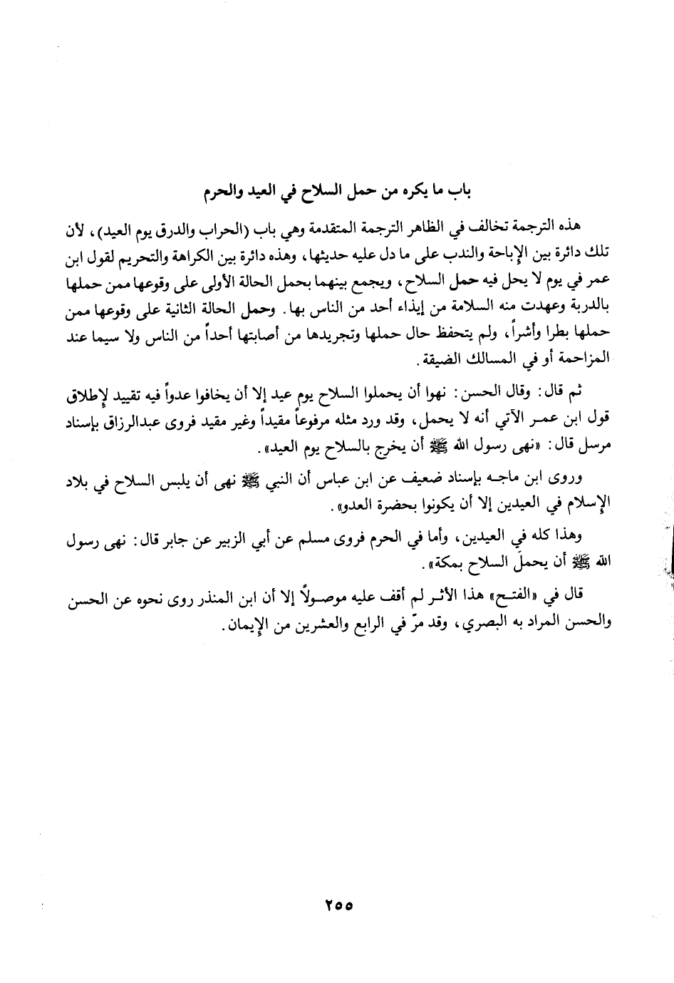 ثم قال: وقال الحسن: نهوا أن يحملوا السلاح يوم عيد إلا أن يخافوا عدوًا فيه تقييد لإطلاق قول ابن عمر الآتي أنه لا يحمل، وقد ورد مثله مرفوعًا مقيدًا وغير مقيد فروى عبد الرزاق بإسناد مرسل قال: "نهى رسول الله -صلى الله عليه وسلم- أن يخرج بالسلاح يوم العيد".