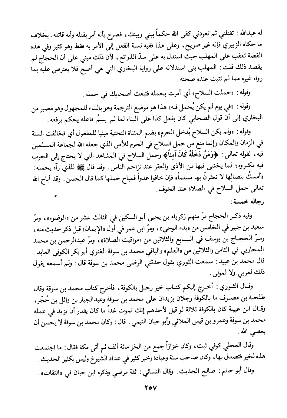 له عبد الله: تقتلني ثم تعودني كفى الله حكمًا بيني وبينك، فصرح بأنه أمر بقتله وأنه قاتله. بخلاف ما حكاه الزبيري فإنه غير صريح، وعلى هذا ففيه نسبة الفعل إلى الأمر به فقط وهو كثير وفي هذه القصة تعقب على المهلب حيث استدل به على سدّ الذرائع؛ لأن ذلك مبني على أن الحجاج لم يقصد ذلك قلت: المهلب بني استدلاله على رواية البخاري التي هي أصح فلا يعترض عليه بما رواه غيره مما لم تثبت عنده صحته.