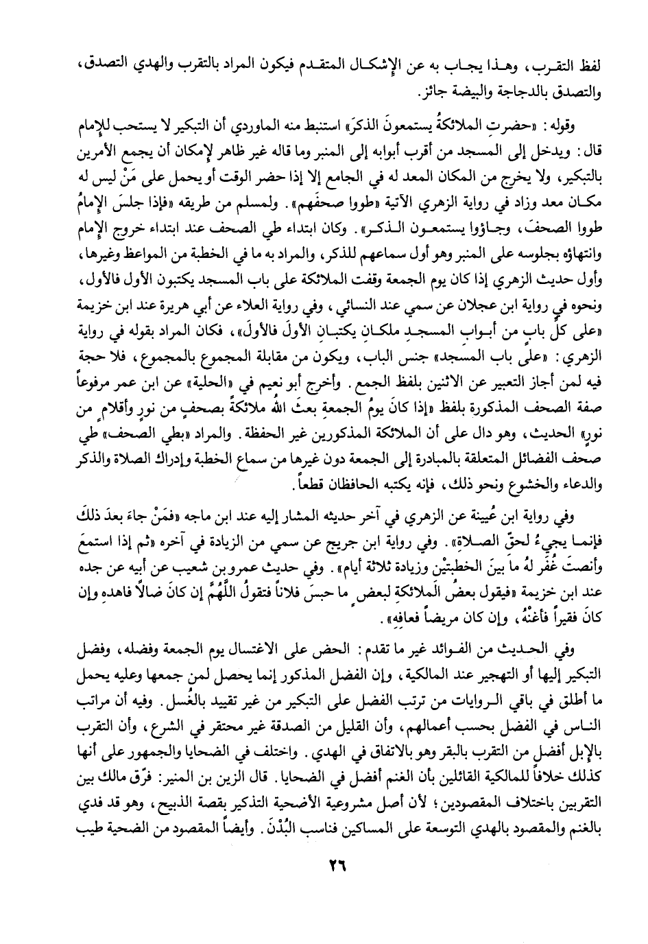وفي رواية ابن عُيينة عن الزهري في آخر حديثه المشار إليه عند ابن ماجه "فمَنْ جاءَ بعدَ ذلكَ فإنما يجيِءُ لحقّ الصلاةِ". وفي رواية ابن جريج عن سمي من الزيادة في آخره "ثم إذا استمعَ وأنصتَ غُفَر لهُ ماَ بينَ الخطبتيْنِ وزيادة ثلاثة أيام". وفي حديث عمرو بن شعيب عن أبيه عن جده عند ابن خزيمة "فيقول بعضُ الملائكةِ لبعضٍ ما حبسَ فلانًا فتقولُ اللَّهُمَّ إن كانَ ضالًا فاهدهِ وإن كانَ فقيرًا فأغنْهُ، وإن كان مريضًا فعافِهِ".