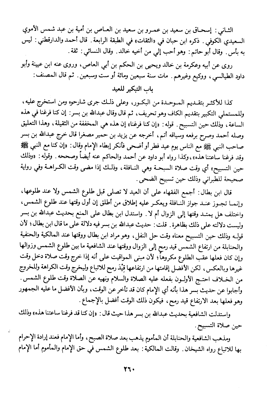 قال ابن بطال: أجمع الفقهاء على أن العيد لا تصلى قبل طلوع الشمس ولا عند طلوعها، وإنما تجوز عند جواز النافلة ويعكر عليه إطلاق من أطلق إن أول وقتها عند طلوع الشمس، واختلف هل يمتد وقتها إلى الزوال أم لا. واستدل ابن بطال على المنع بحديث عبد الله بن بسر وليست دلالته على ذلك بظاهرة. قلت: حديث عبد الله بن بسر فيه دلالة على ما قال ابن بطال؛ لأن قوله وذلك حين التسبيح معناه وقت حل النفل، وهو مراد ابن بطال ووقتها عند المالكية والحنفية والحنابلة من ارتفاع الشمس قيد رمح إلى الزوال ووقتها عند الشافعية ما بين طلوع الشمس وزوالها وإن كان فعلها عقب الطلوع مكروهًا؛ لأن مبنى المواقيت على أنه إذا خرج وقت صلاة دخل وقت غيرها وبالعكس، لكن الأفضل إقامتها من ارتفاعها قِيْدَ رمح للاتباع وليخرج وقت الكراهة وللخروج من الخلاف احتج الأولون بفعله عليه الصلاة والسلام ونهيه عن الصلاة وقت طلوع الشمس. وأجابوا عن حديث بسر هذا بأنه أي الإِمام كان قد تأخر عن الوقت، وبأن الأفضل ما عليه الجمهور وهو فعلها بعد الارتفاع قيد رمح، فيكون ذلك الوقت أفضل بالإجماع.